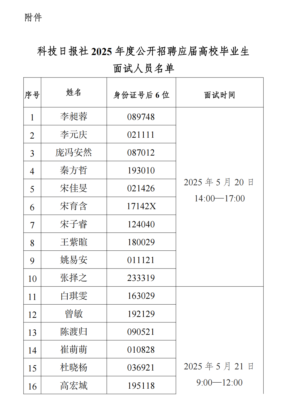 附件:科技日?qǐng)?bào)社2025年度公開(kāi)招聘應(yīng)屆高校畢業(yè)生面試人員名單
