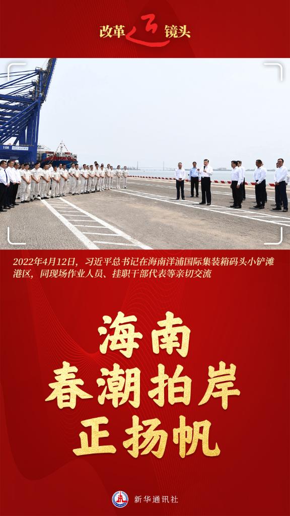 2022年4月12日,習(xí)近平總書記來到海南洋浦國際集裝箱碼頭小鏟灘港區(qū),同現(xiàn)場(chǎng)作業(yè)人員、掛職干部代表等親切交流。