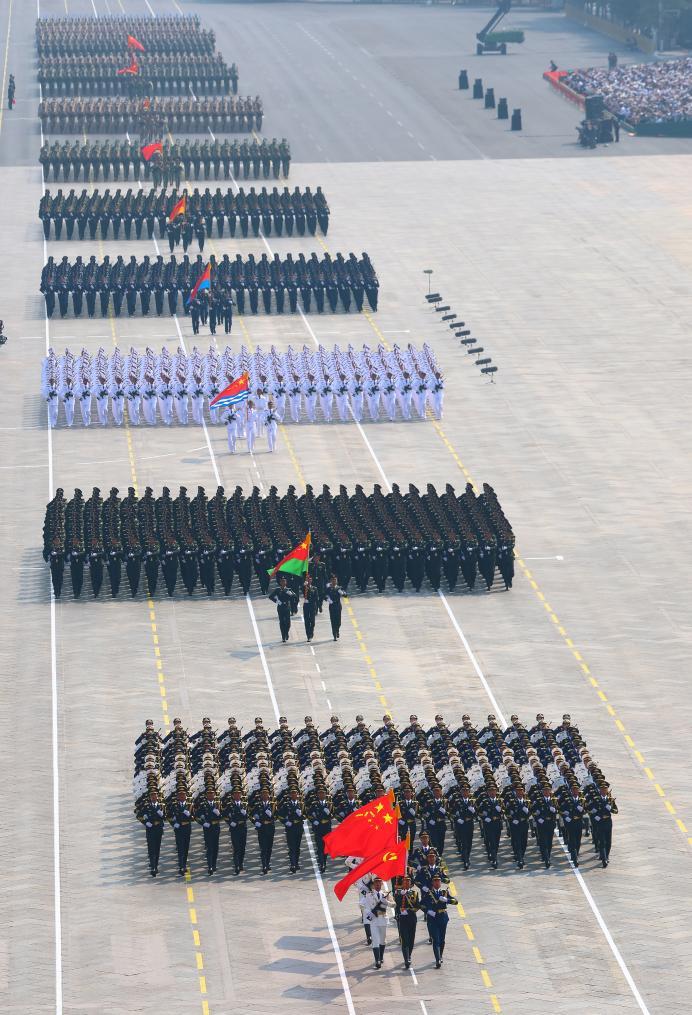 9時15分,閱兵儀式開始。藍天下,被金色陽光鋪灑的長安街明亮而寬闊,人民解放軍雄師列陣,氣勢如虹。