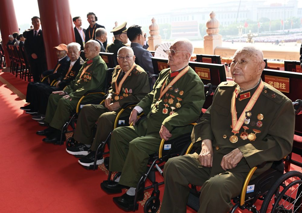 9月3日,首都北京,天安門城樓上,六名從烽火硝煙中走來的抗戰老戰士老同志受邀觀禮。