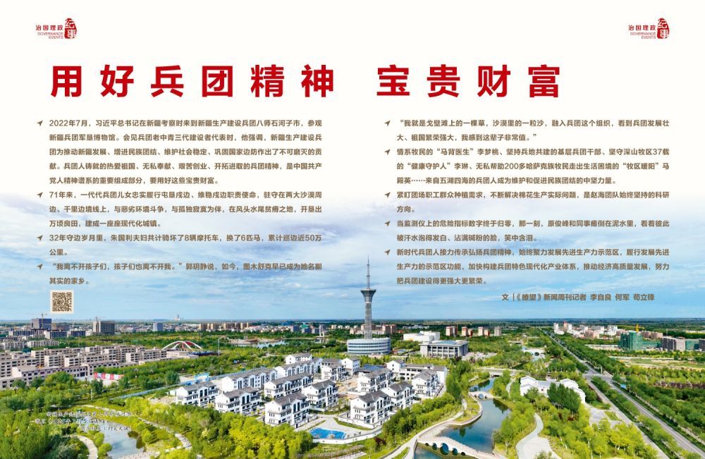 ◇2022年7月,習近平總書記在新疆考察時來到新疆生產建設兵團八師石河子市,參觀新疆兵團軍墾博物館。會見兵團老中青三代建設者代表時,他強調,新疆生產建設兵團為推動新疆發展、增進民族團結、維護社會穩定、鞏固國家邊防作出了不可磨滅的貢獻。兵團人鑄就的熱愛祖國、無私奉獻、艱苦創業、開拓進取的兵團精神,是中國共產黨人精神譜系的重要組成部分,要用好這些寶貴財富。