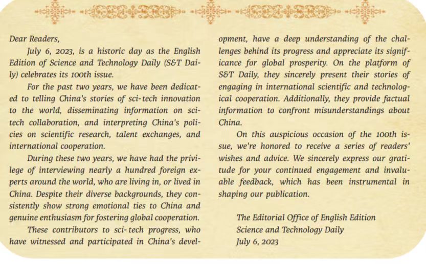 First and foremost, let me extend my heartfelt congratulations to the English Edition of Science and Technology Daily (also known as S&T Daily) on reaching its two-year milestone and publishing its 100th issue! The creation of this English edition serves as a catalyst for fostering academic and educational exchanges between China and foreign countries.