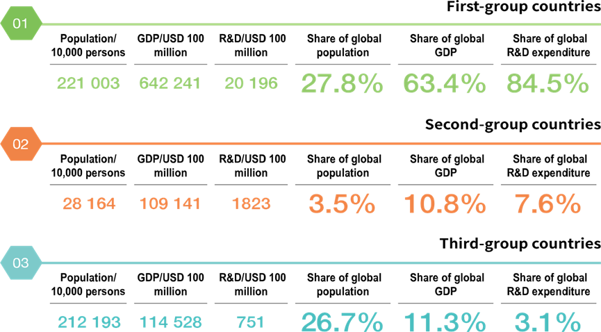 Compared globally, the innovation gap among countries remains significant, with the majority of R&D activities and innovation outputs concentrated in the first group of countries. By calculating the population, R&D expenditure, and GDP shares of each country globally, we can see that: The first group of countries, though representing only 27.8% of the global population, contributes 84.5% of the global R&D expenditure and 63.4% of the global GDP. The second group of countries represents 3.5% of the global population, 7.6% of the global R&D expenditure, and 10.8% of the global GDP. The third group of countries accounts for 26.7% of the global population but only 3.1% of the global R&D expenditure and 11.3% of the global GDP.