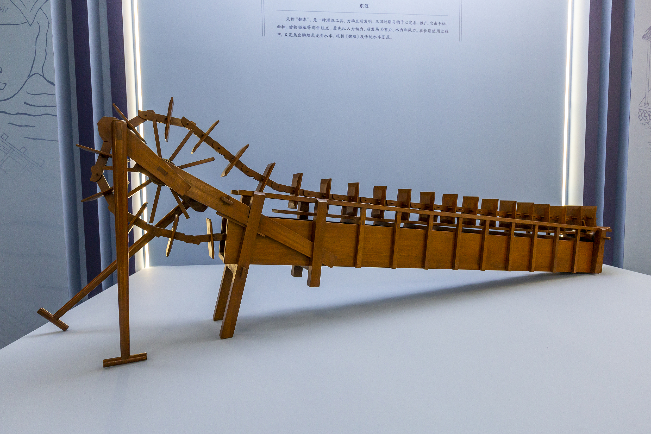 The dragonbone water lift, a milestone invention first made during the Eastern Han Dynasty (25-220), is a wooden machine used for irrigation.