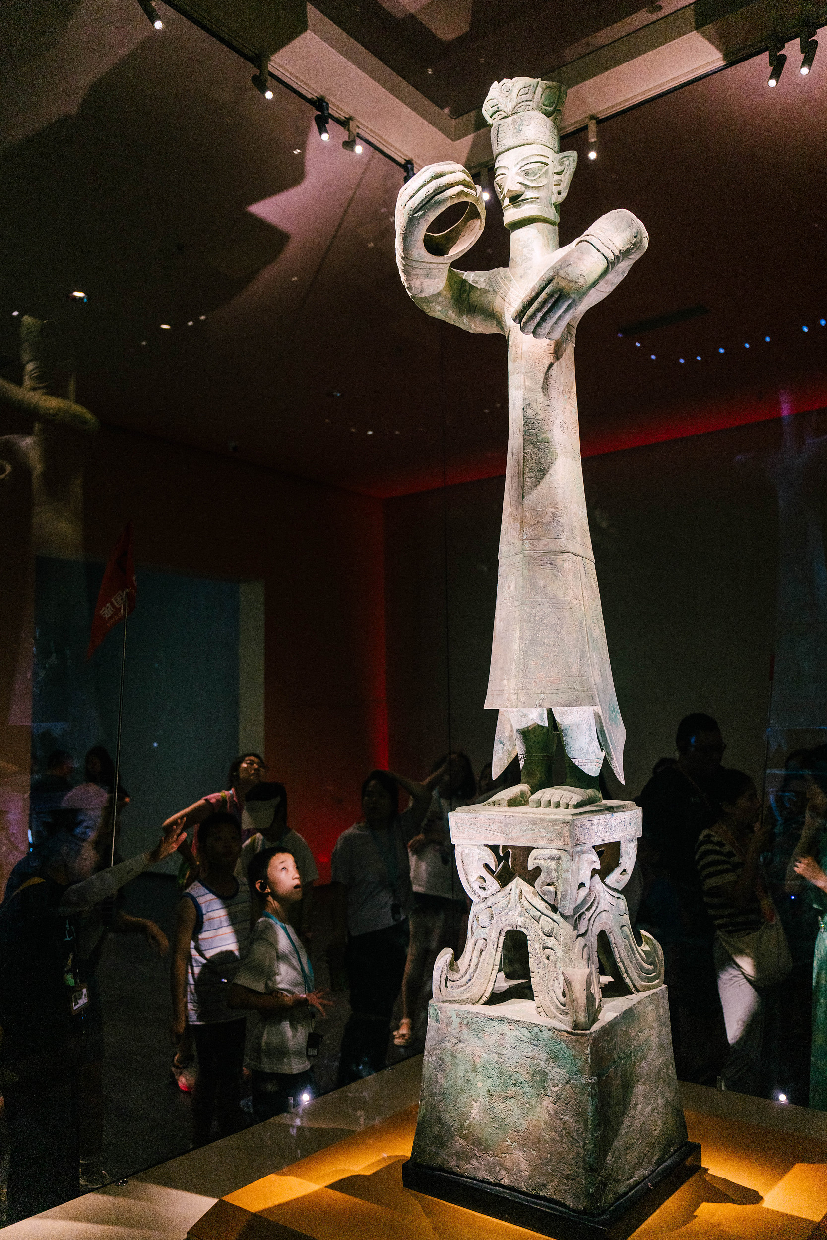 The grand statue of a human figure in bronze, on display at the new Sanxingdui Museum in Sichuan province, southwest China, is the tallest and most complete standing bronze figure in existence.