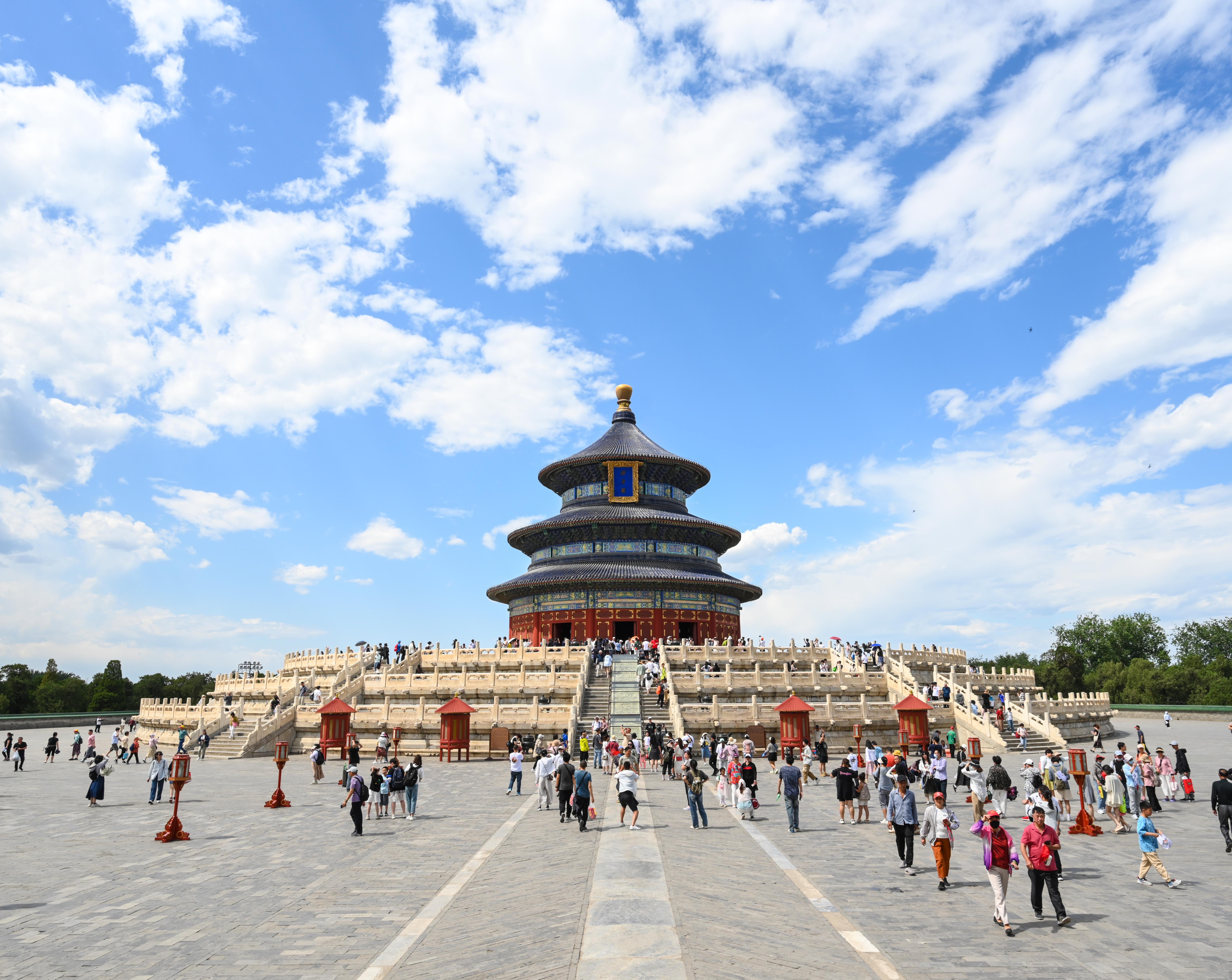 The Temple of Heaven is one of the most significant heritage sites along Beijing's Central Axis. As the main structure of the Temple of Heaven, the Hall of Prayer for Good Harvests stands on a three-tiered pedestal made of pure white marble, making it one of the tallest ancient buildings in Beijing.