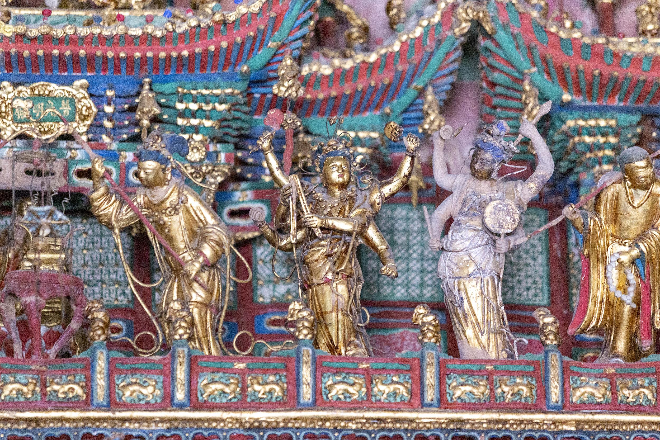 In Chinese Buddhist statue art, suspended sculpture is a relatively uncommon form of art. Suspended sculptures are typically supported by walls or beams, with colorful sculptures hanging on fixed wooden frames.