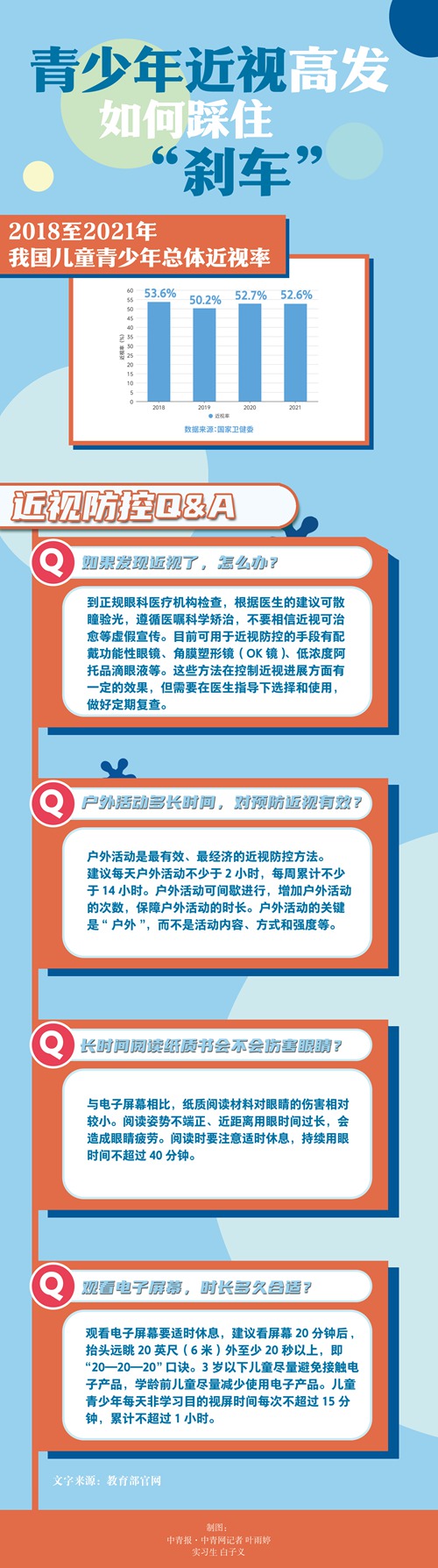 如今,青少年近視問題已經成為社會各界關心的熱點與痛點。2018年印發的《綜合防控兒童青少年近視實施方案》提出的目標是,到2023年,力爭實現全國兒童青少年總體近視率在2018年的基礎上每年降低0.5個百分點以上。而國家衛健委的公開數據顯示,2018至2021年,我國兒童青少年總體近視率分別為53.6%,50.2%、52.7%、52.6%。