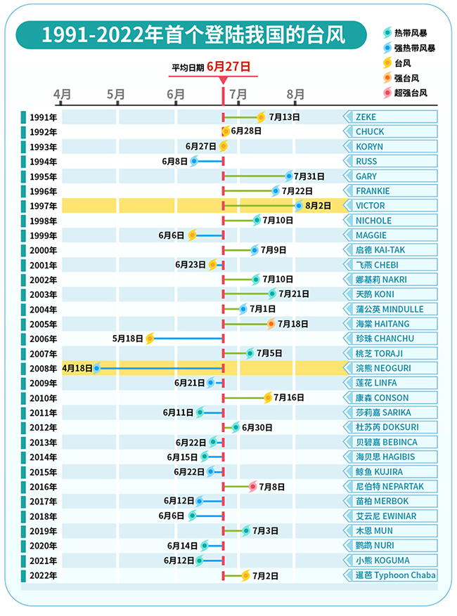 1991-2022年首個登陸我國的臺風名稱、登陸日期及登陸時強度。丁茜制圖
