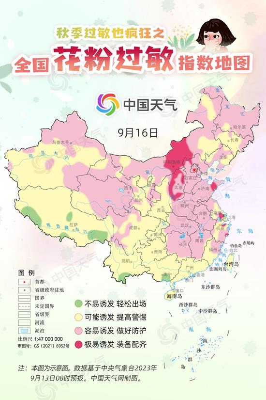 “9月14日至16日,我國中東部大部地區都處于容易過敏區域,其中內蒙古、山西、山東等地部分地區極易誘發過敏?!敝袊鞖饩W氣象分析師王偉躍表示,目前北方正處于夏秋轉換時節,此時常見的花粉過敏原有蒿屬、葎草屬、豚草屬等草類,北方晴朗干燥天氣利于這些草類的花粉傳播。