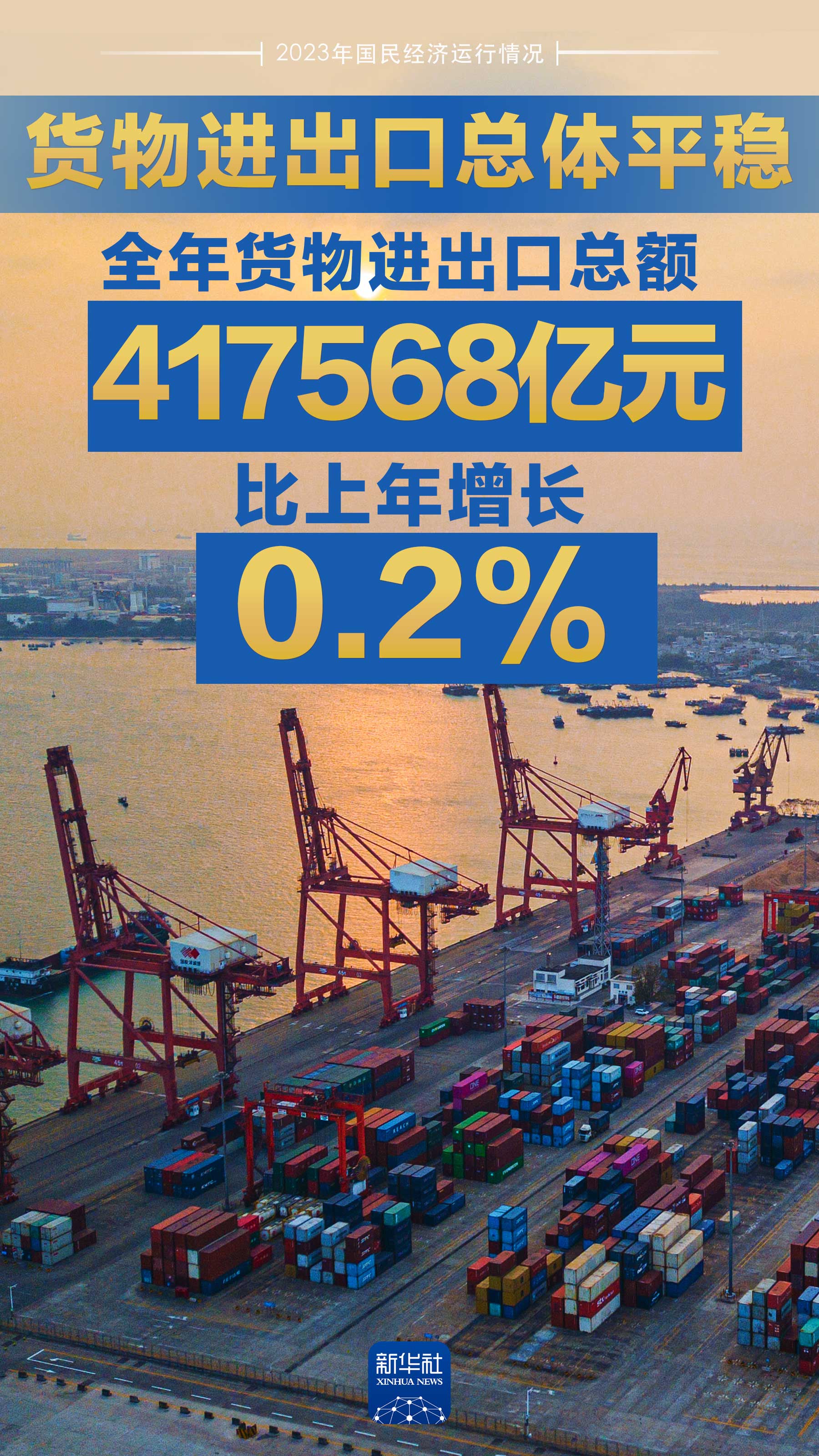 2023年我國外貿運行總體平穩:全年貨物進出口總額417568億元,比上年增長0.2%。其中,出口237726億元,增長0.6%;進口179842億元,下降0.3%。進出口相抵,貿易順差57884億元。電動載人汽車、鋰離子蓄電池和太陽能電池等“新三樣”產品合計出口首次突破萬億元大關,增長29.9%。