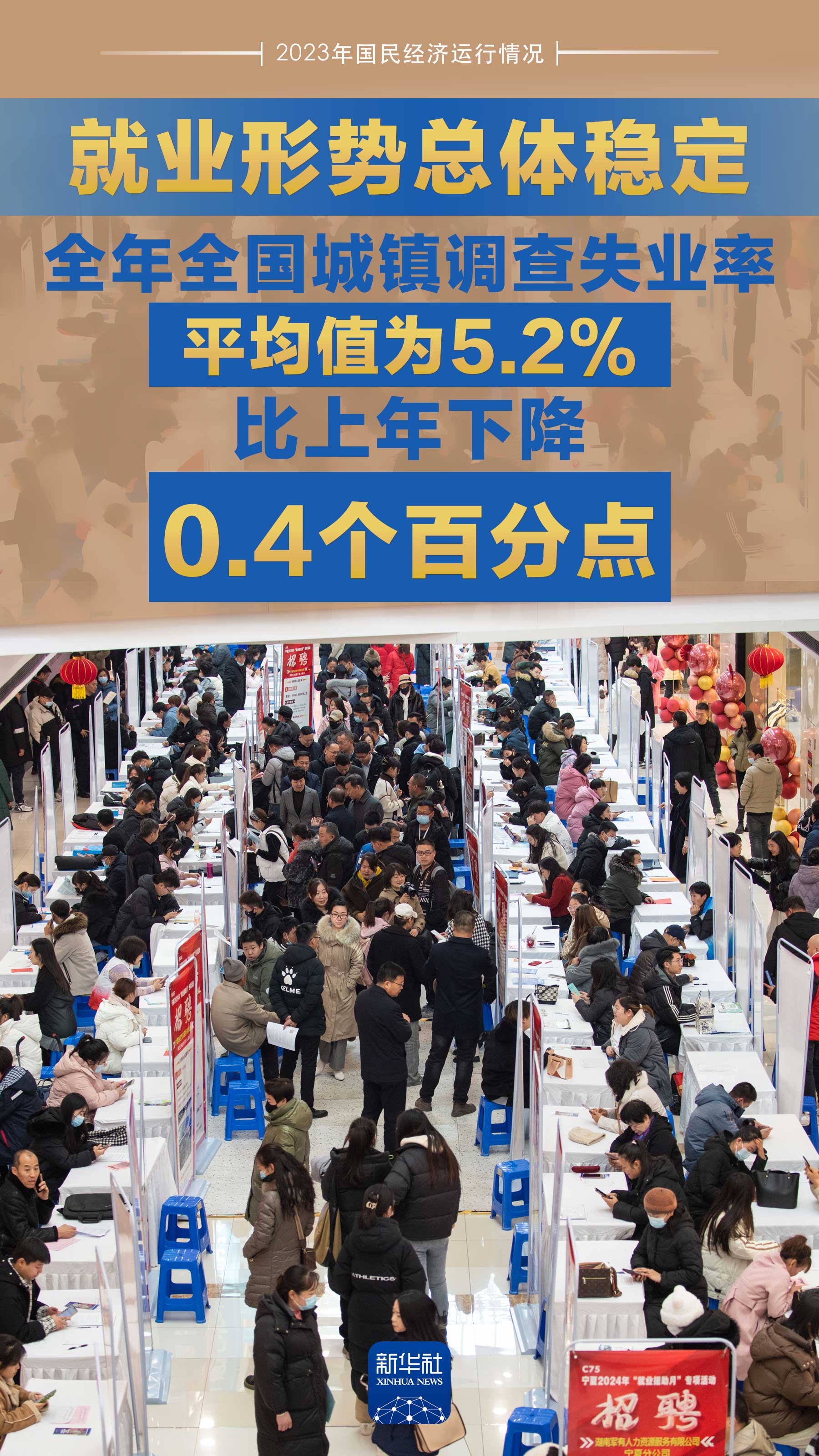 全年全國城鎮調查失業率平均值為5.2%,比上年下降0.4個百分點
