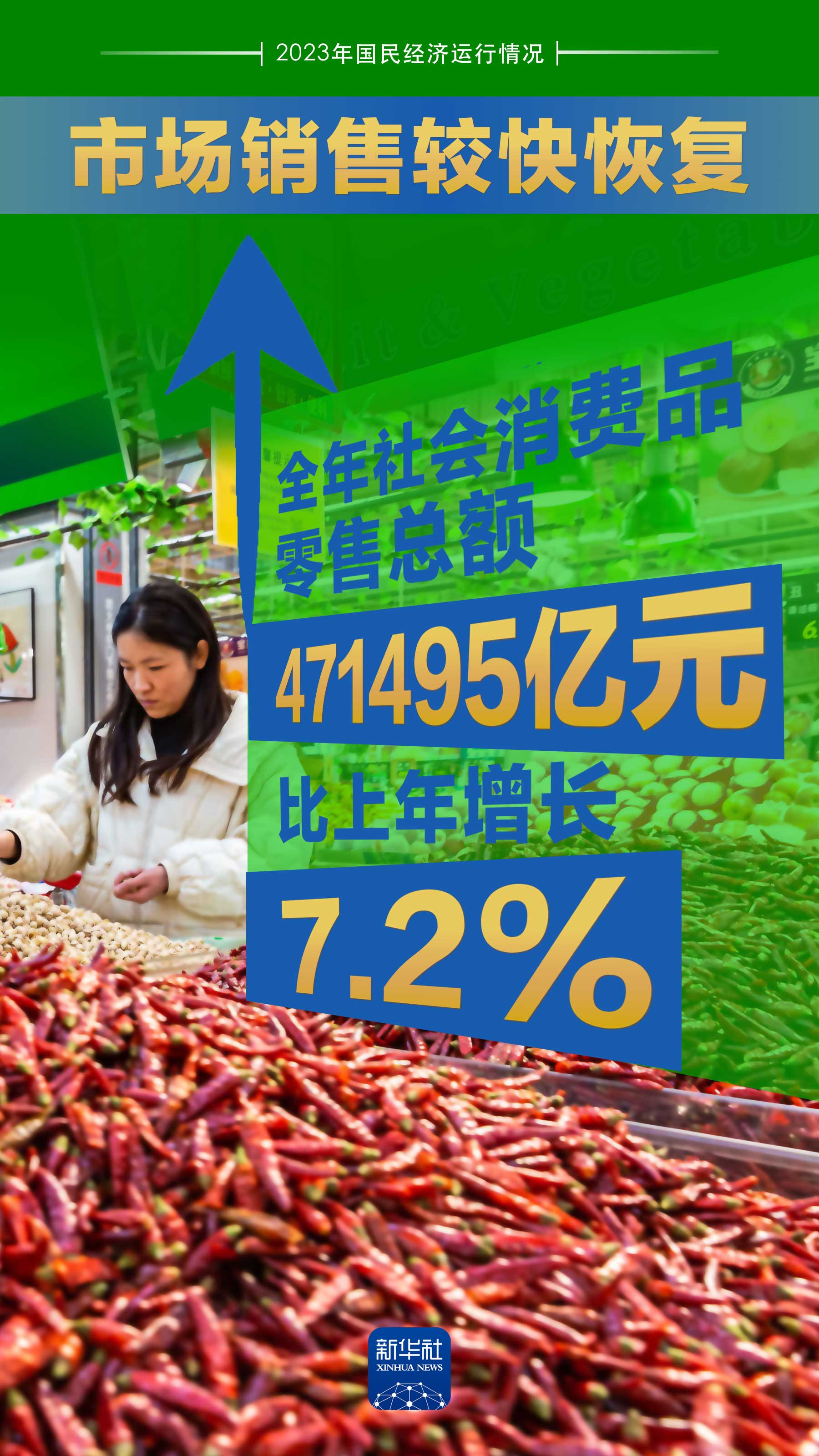 2023年消費市場恢復向好,熱點亮點多,成為帶動經濟恢復的重要力量:社會消費品零售總額471495億元,創歷史新高,比上年增長7.2%。