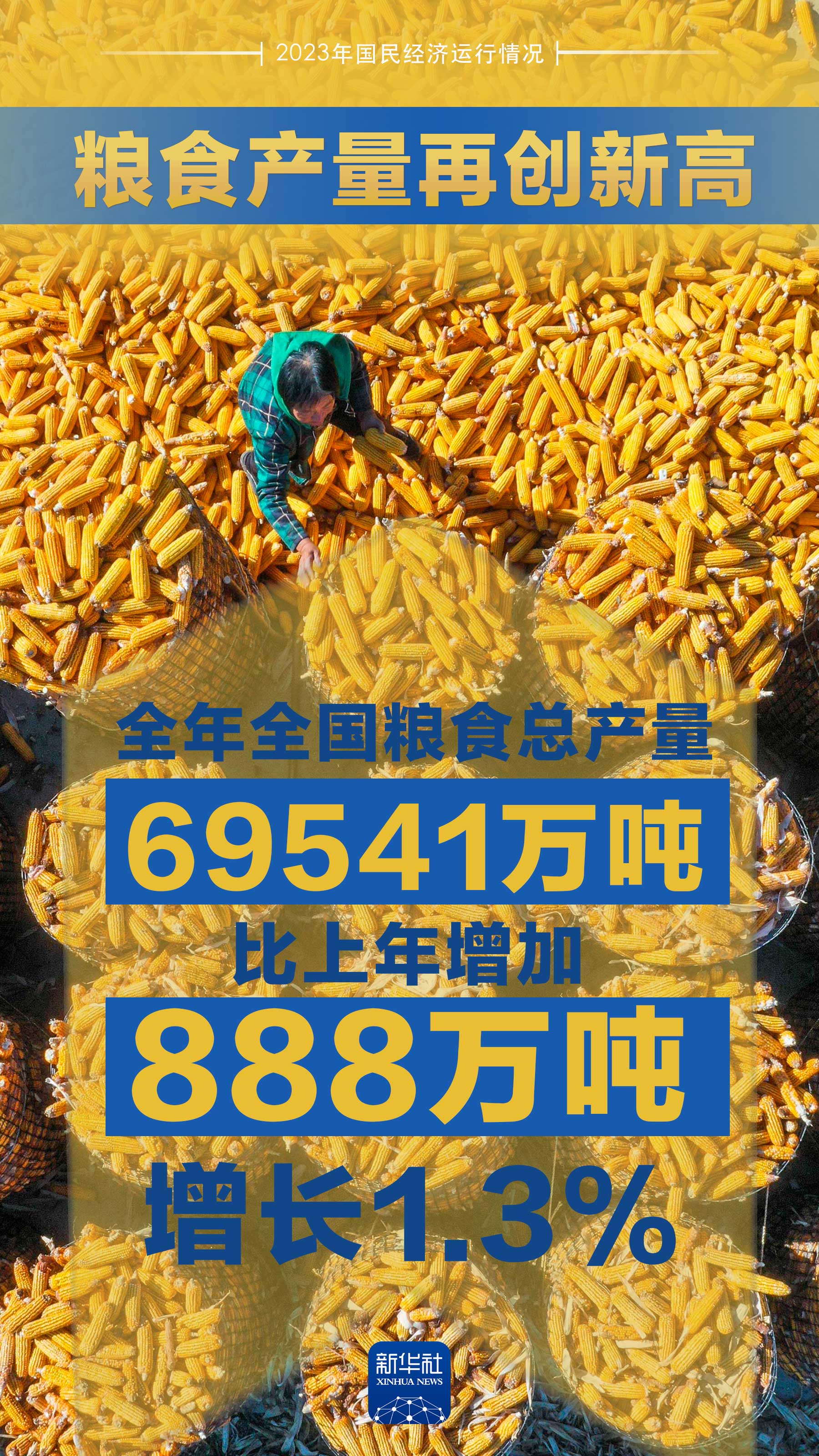 全年全國糧食總產量69541萬噸,比上年增加888萬噸,增長1.3%。其中,夏糧產量14615萬噸,下降0.8%;早稻產量2834萬噸,增長0.8%;秋糧產量52092萬噸,增長1.9%。