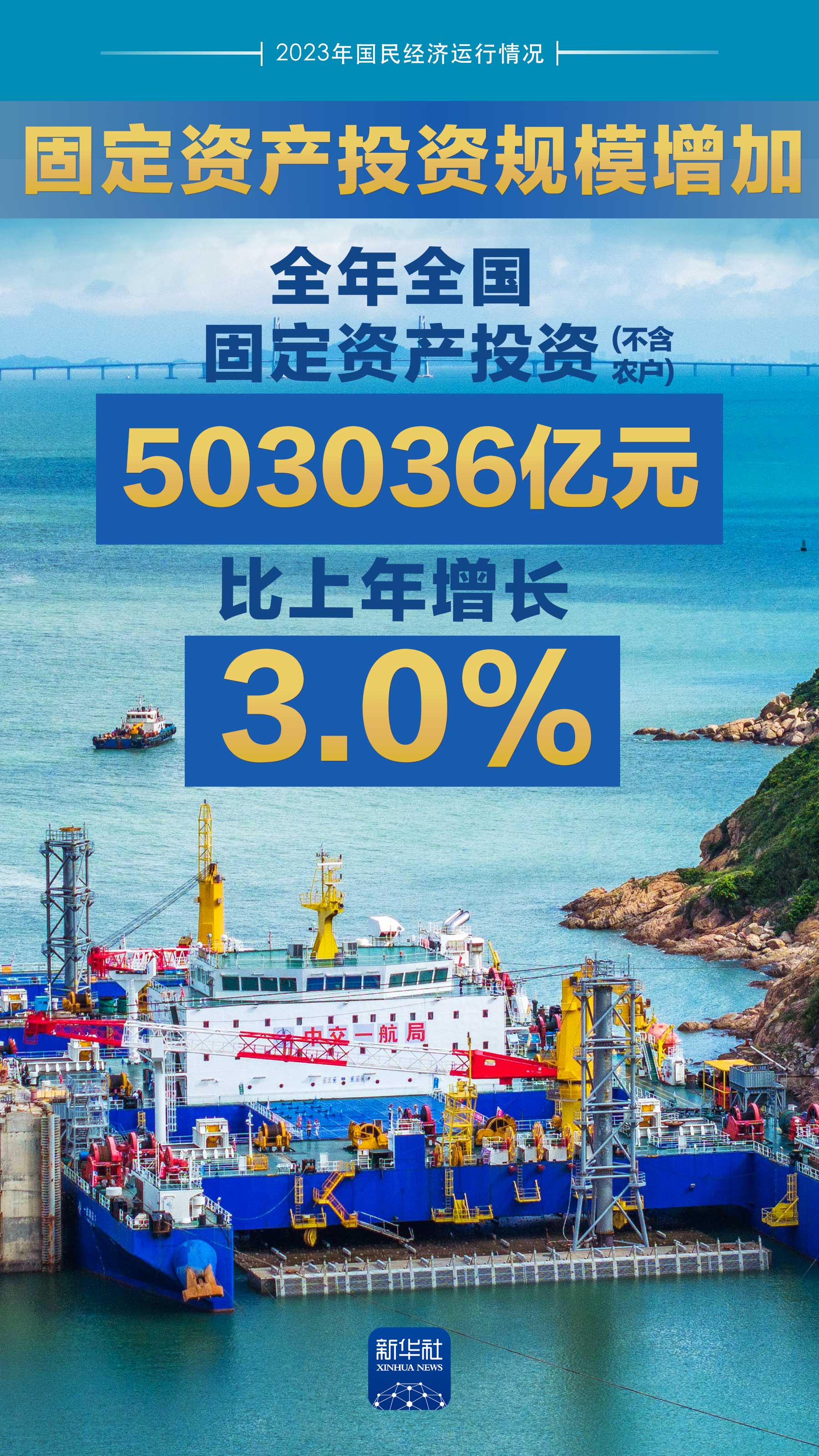 全年全國固定資產投資(不含農戶)503036億元,比上年增長3.0%;扣除價格因素影響,增長6.4%。