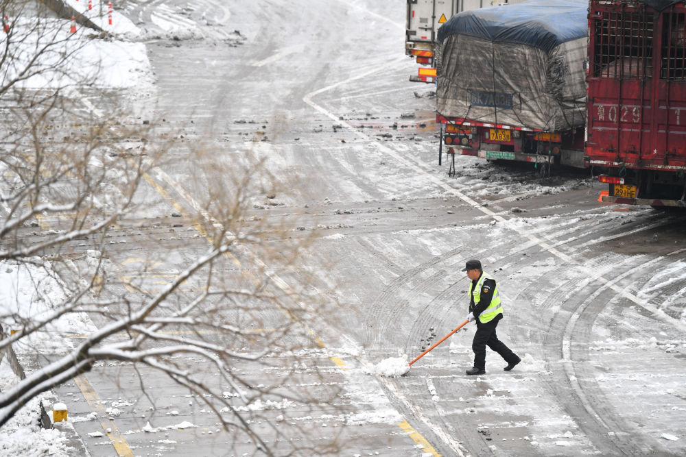 1月16日,包茂高速陜西宜君服務區的工作人員清理地面積雪。新華社記者 張博文 攝