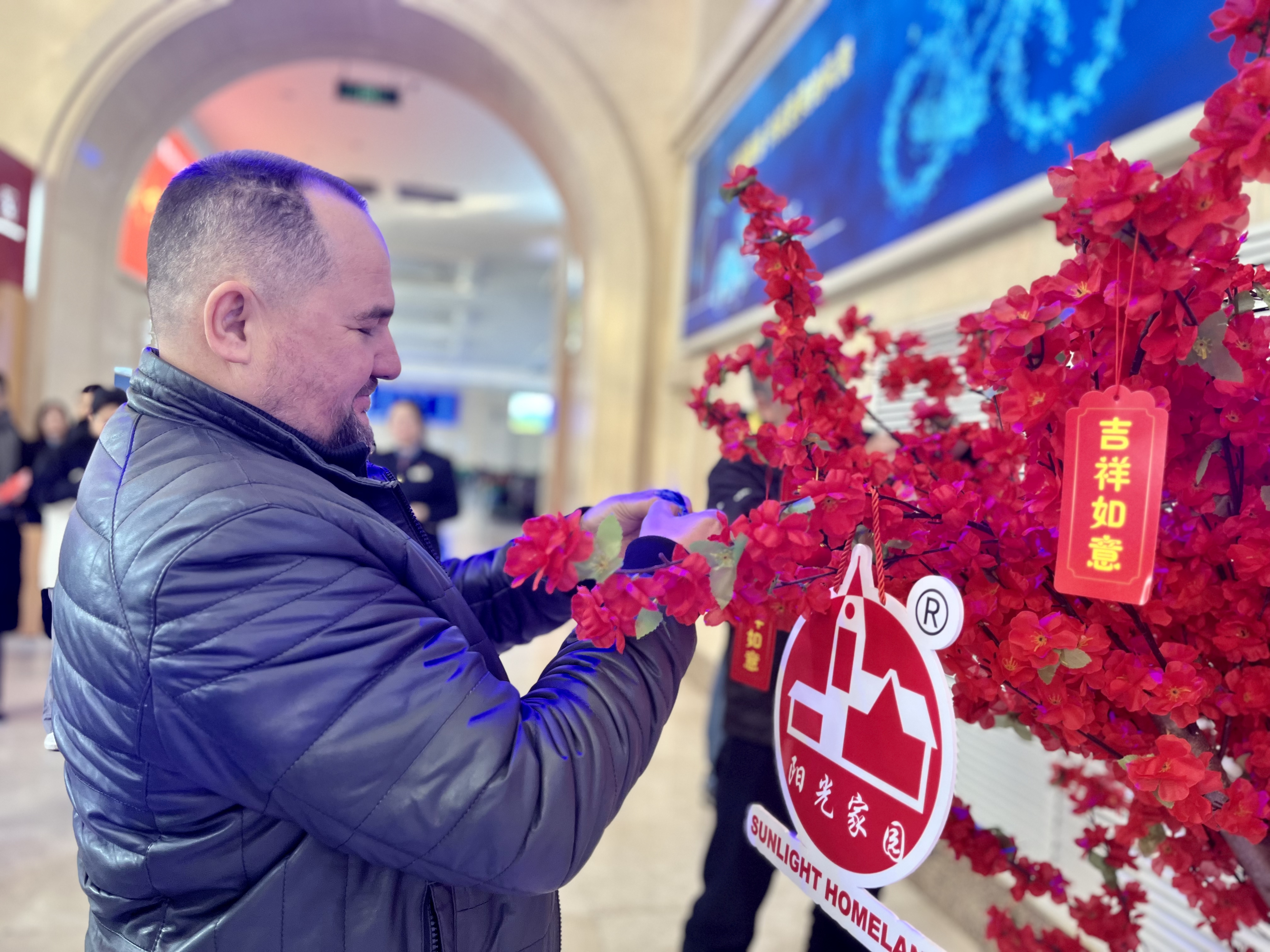 1月26日,鐵路青島站,旅客將心愿卡掛在許愿樹上。科技日報記者 宋迎迎 攝
