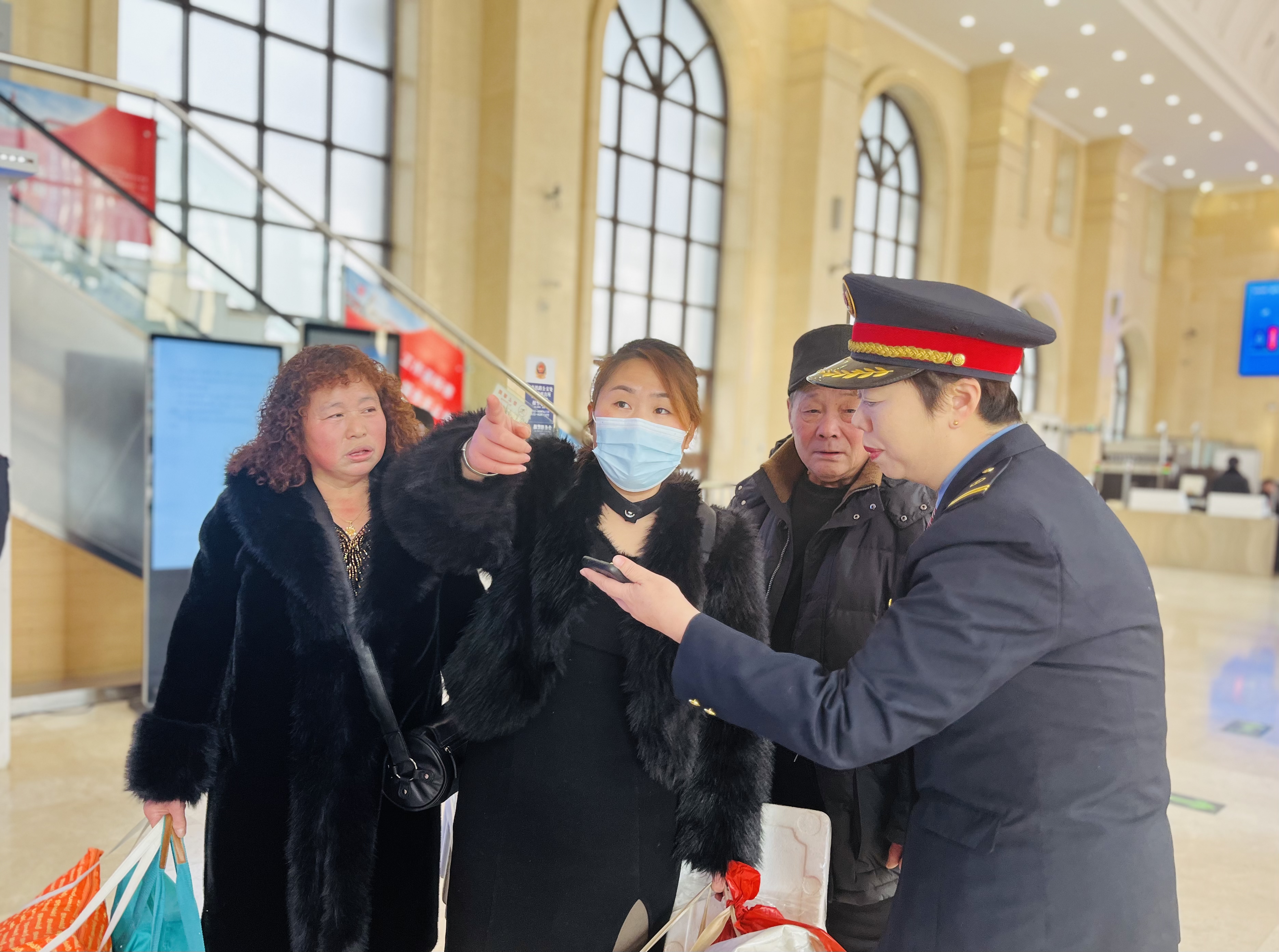 1月26日,鐵路青島站工作人員為旅客提供導引服務。科技日報記者 宋迎迎 攝