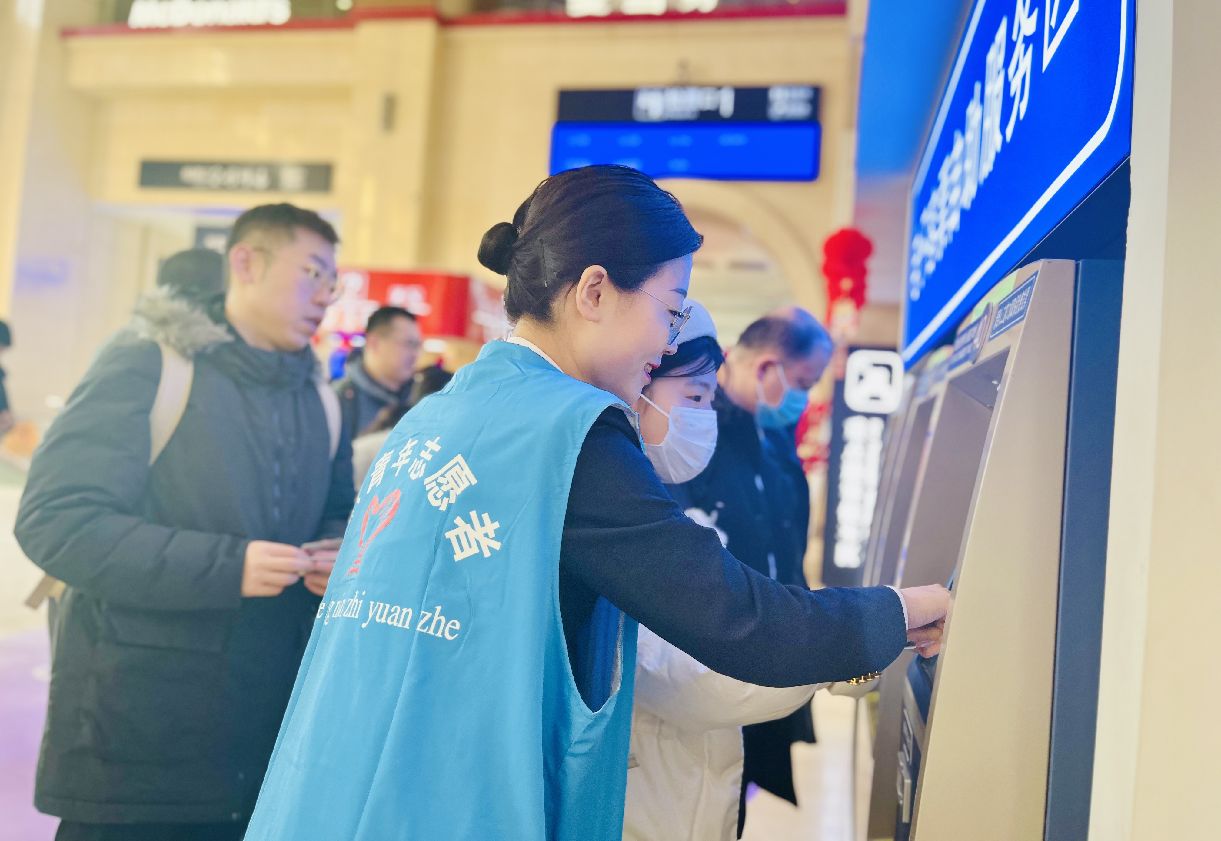 1月26日,鐵路青島站的志愿者指導旅客通過自助售票機購票。科技日報記者 宋迎迎 攝