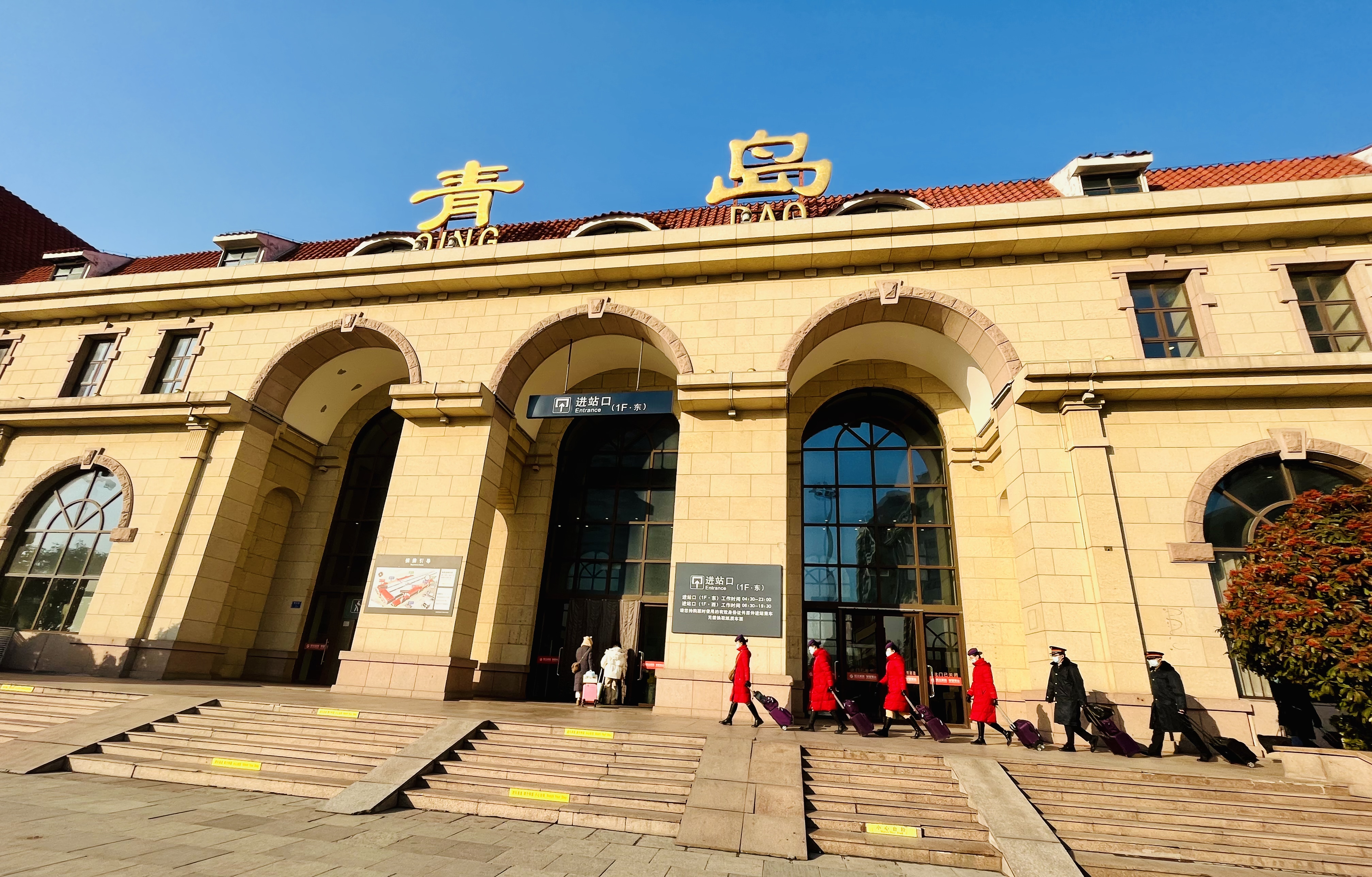 剛踏進鐵路青島站,便看到熙來攘往的人潮,旅客們推著行李箱、提著大包小包排隊安檢進站。