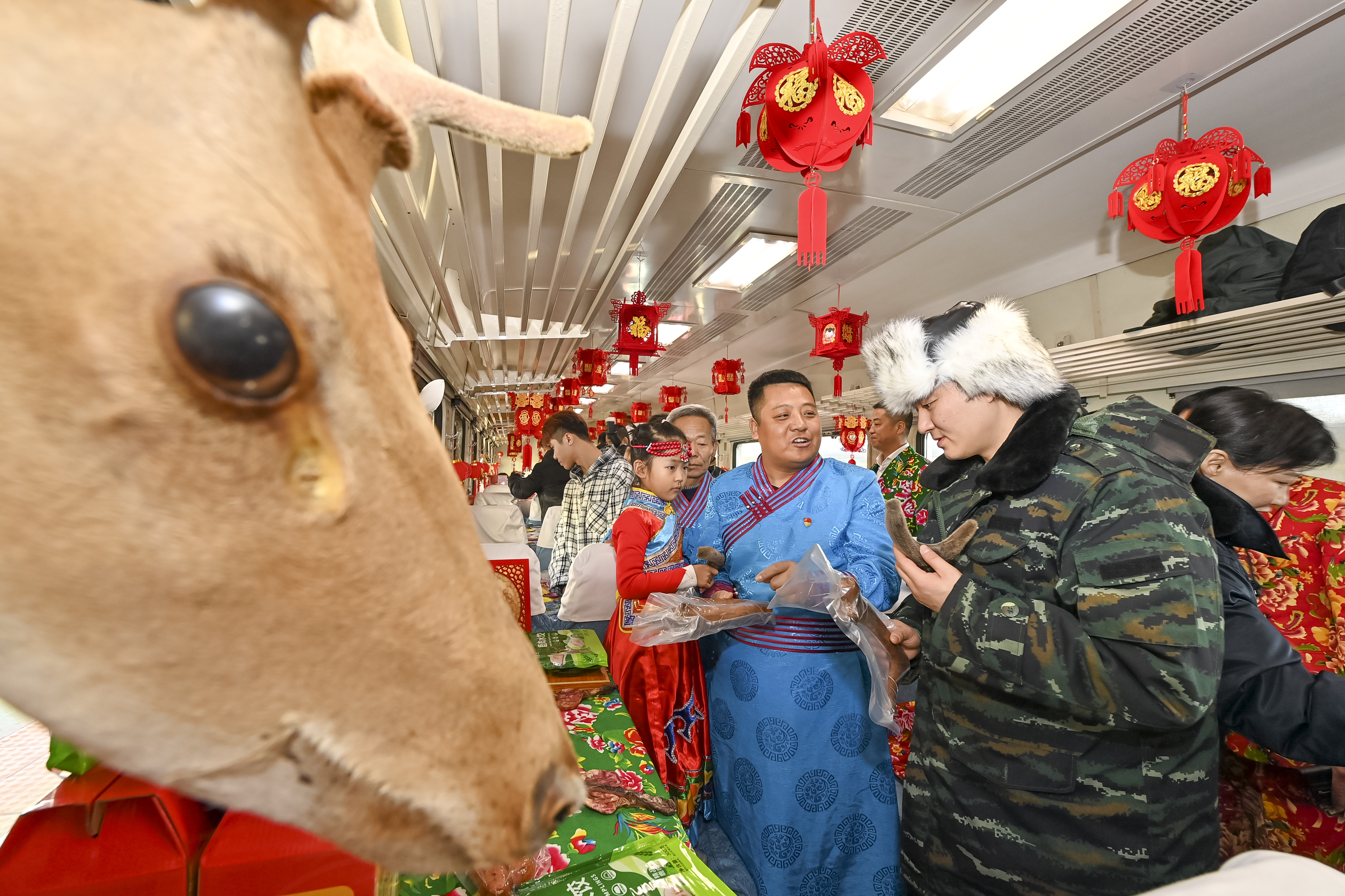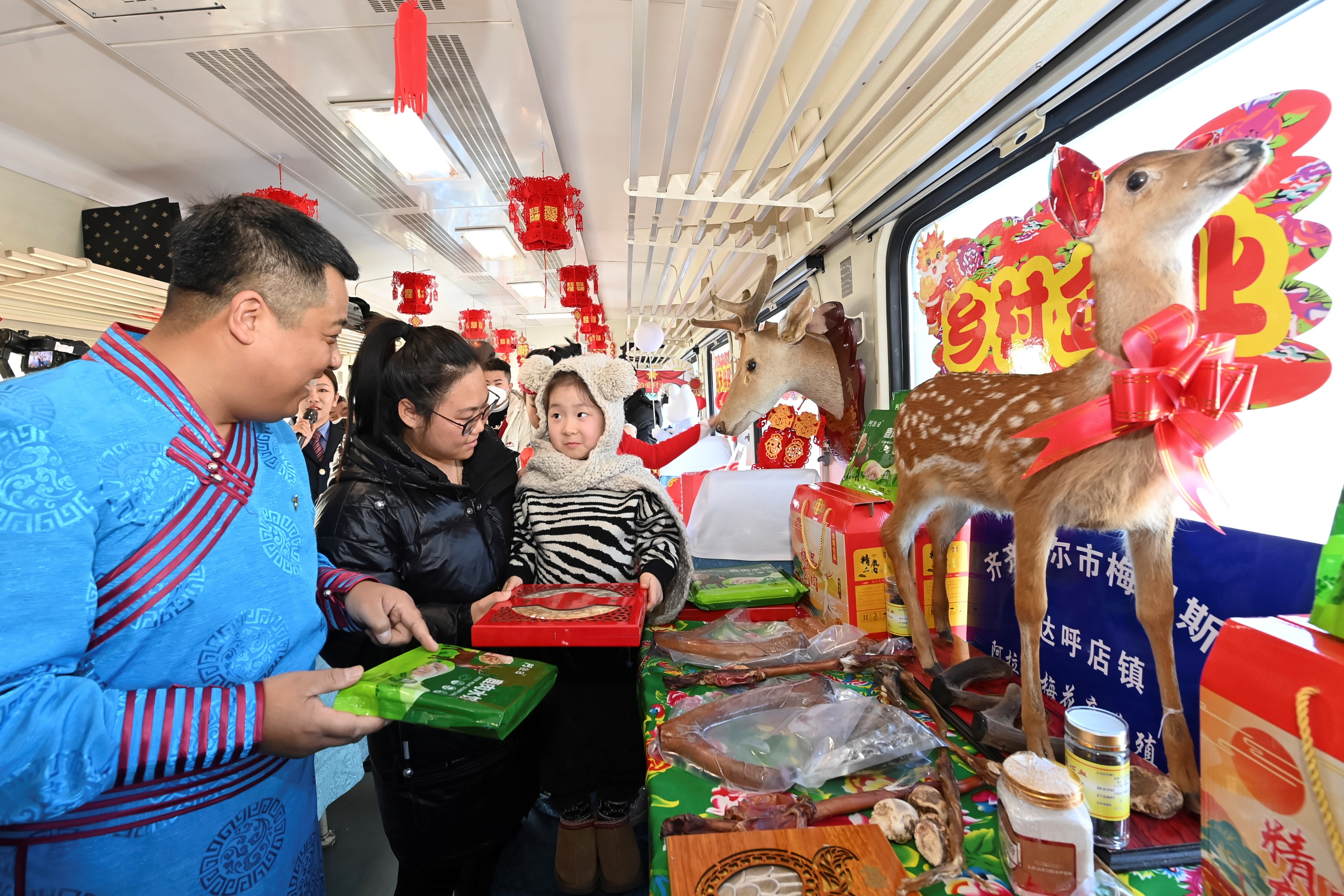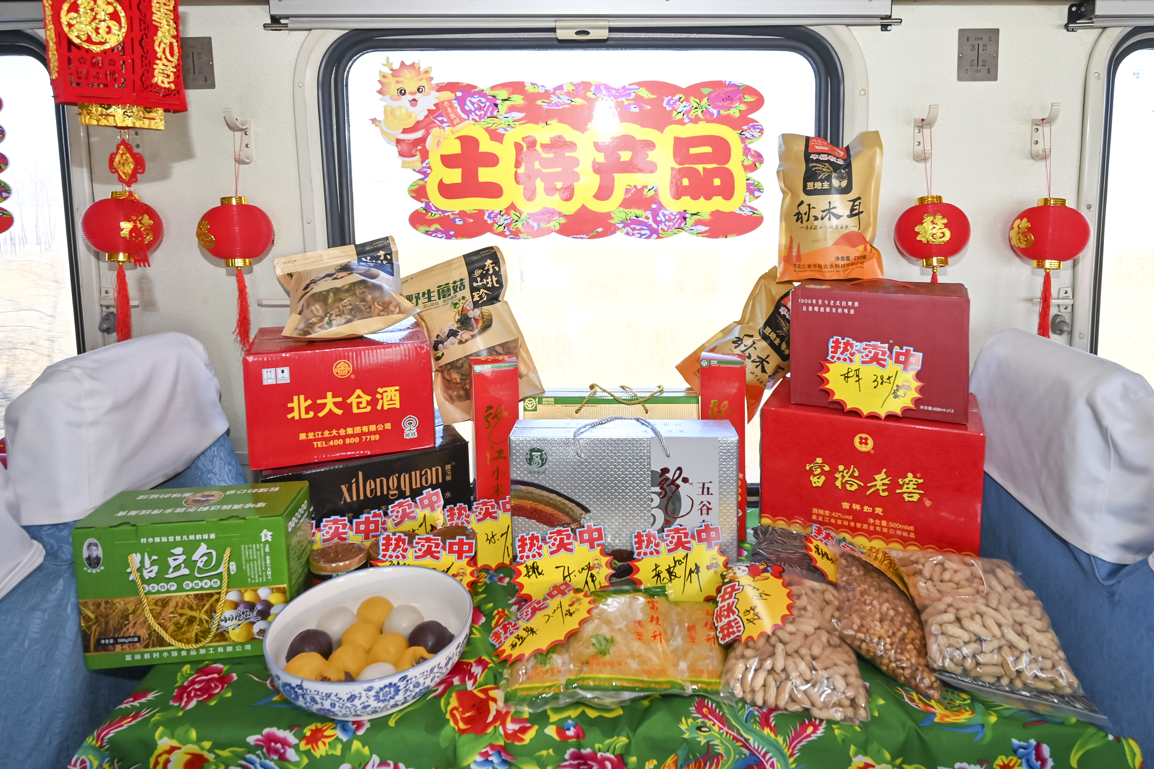 “歡迎來到列車大集挑選東北特色年貨。”1月25日,在齊齊哈爾開往加格達(dá)奇的4045次列車上,車廂里張燈結(jié)彩,桌子上的貨品琳瑯滿目,這是中國鐵路哈爾濱局集團(tuán)有限公司開辦的列車年貨大集。與以往不同的是,今年除生鮮果品外,還有非遺文化產(chǎn)品柴窯茶具、達(dá)斡爾族鹿茸,鹿肉餃子等特色商品,身著鐵路制服的工作人員正在為旅客們介紹。