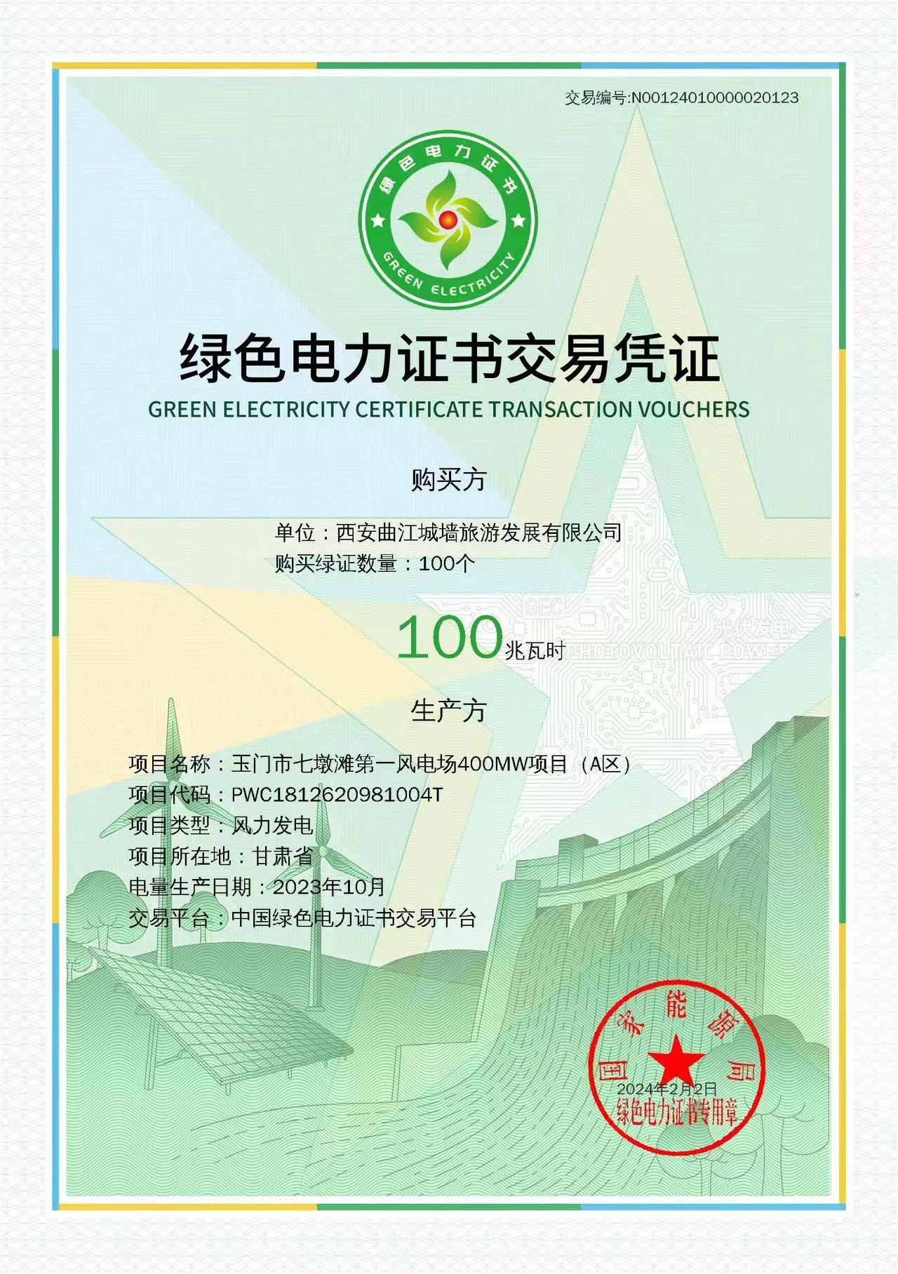 綠色電力證書交易憑證 。西安城墻景區(qū)提供