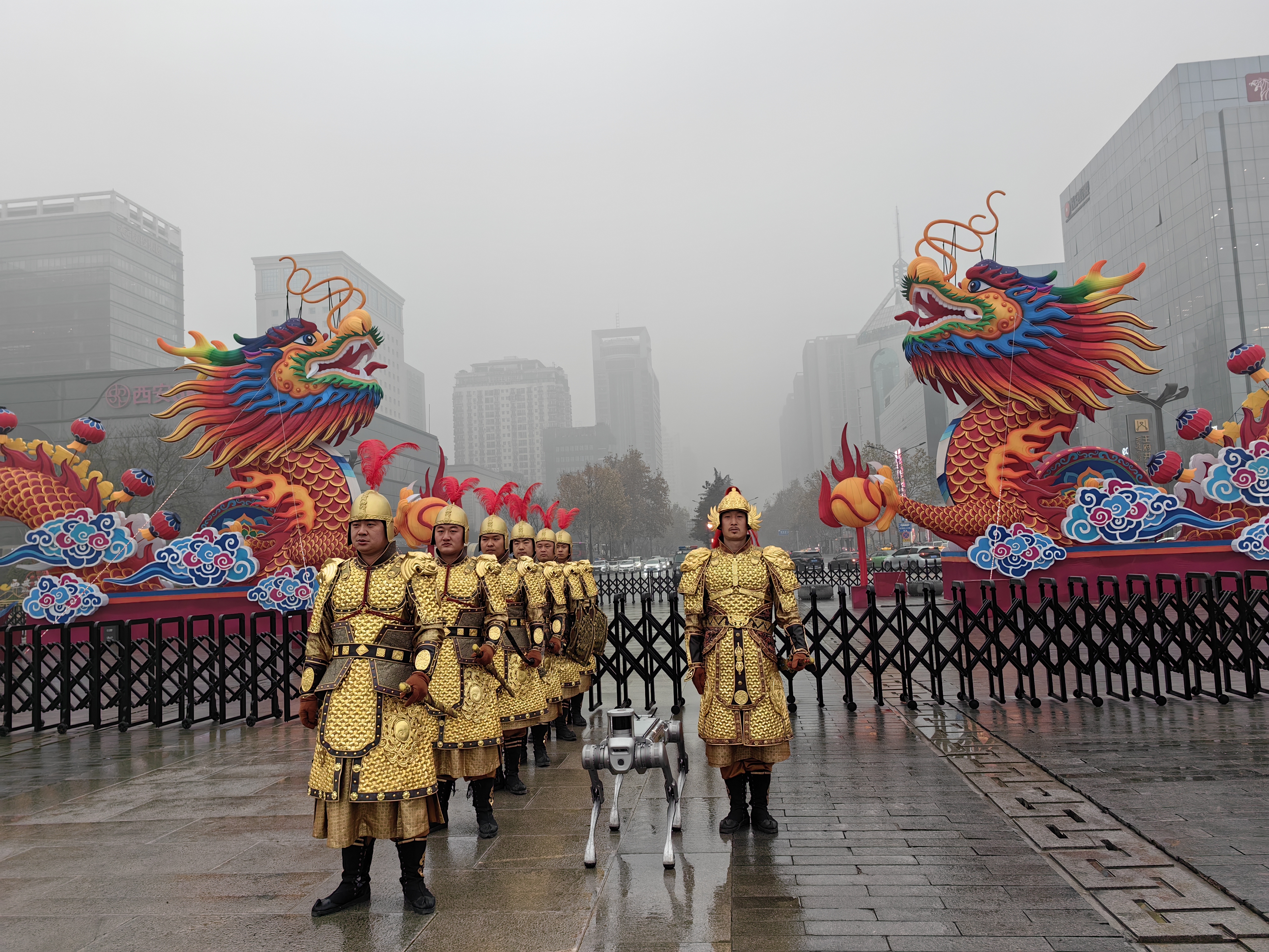 機(jī)器狗在城墻護(hù)衛(wèi)隊的陪同下即將啟程“巡城”。西安城墻景區(qū)提供