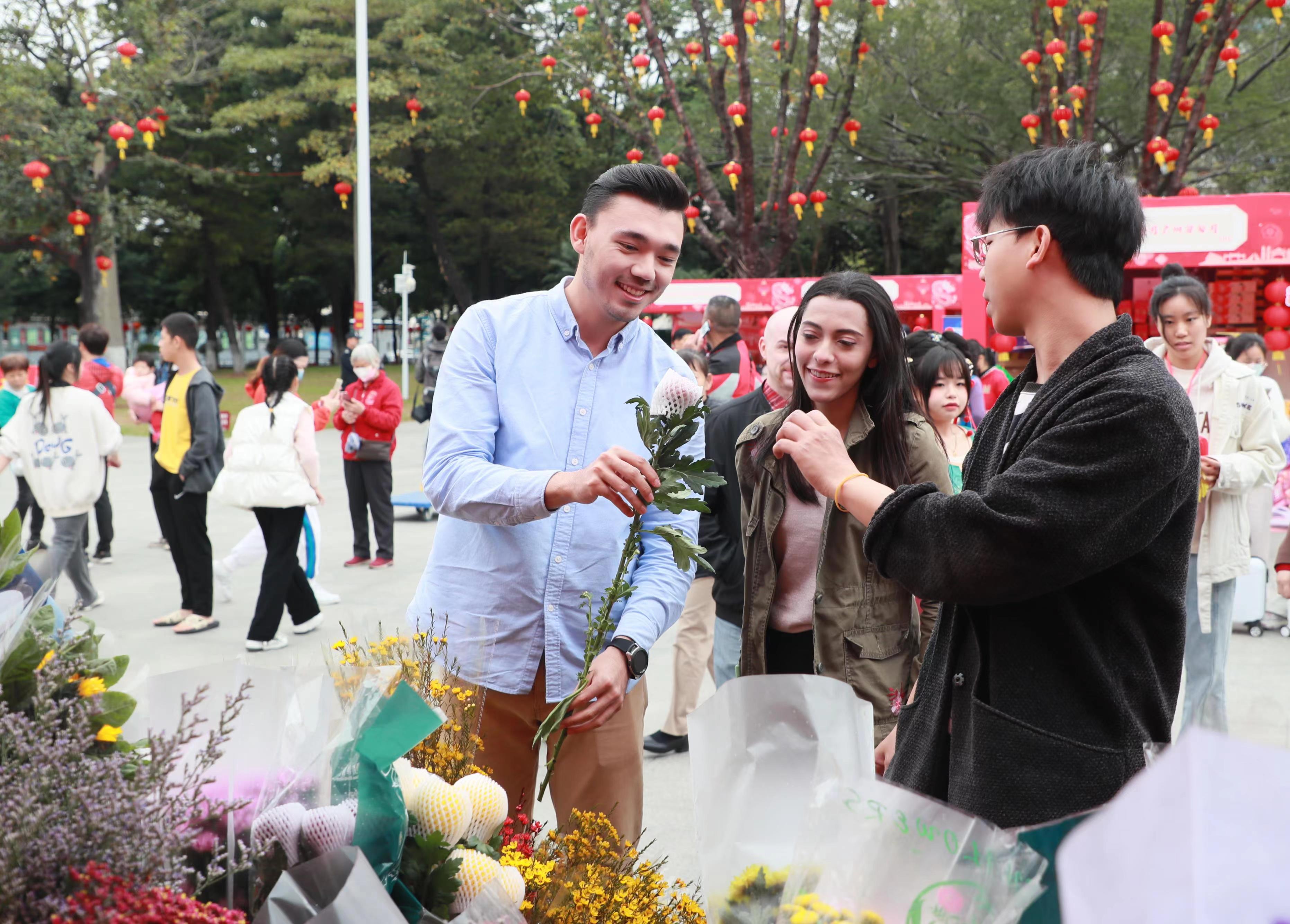 逛花市是廣州每家每戶在春節期間的必備節目。圖為黃埔海外新聞官帶著留學生一同“打卡”海絲城花市。李劍鋒 攝