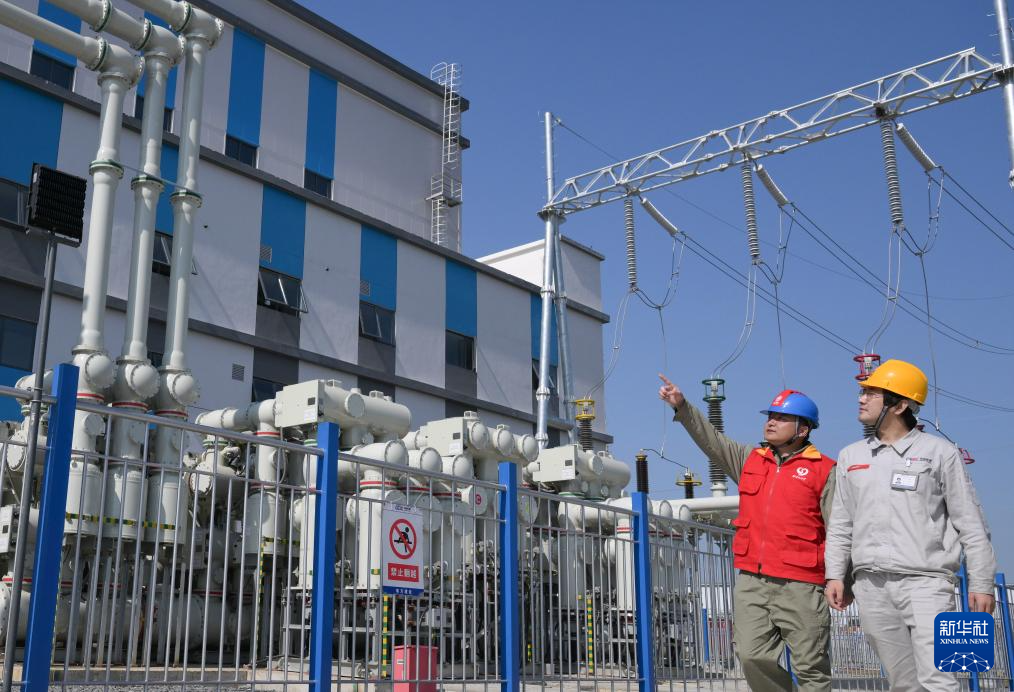4月9日,國網孝感供電公司技術人員(左)與應城300兆瓦級壓縮空氣儲能電站操作人員在巡視電力設備,確保設備運行正常。新華社記者 程敏 攝