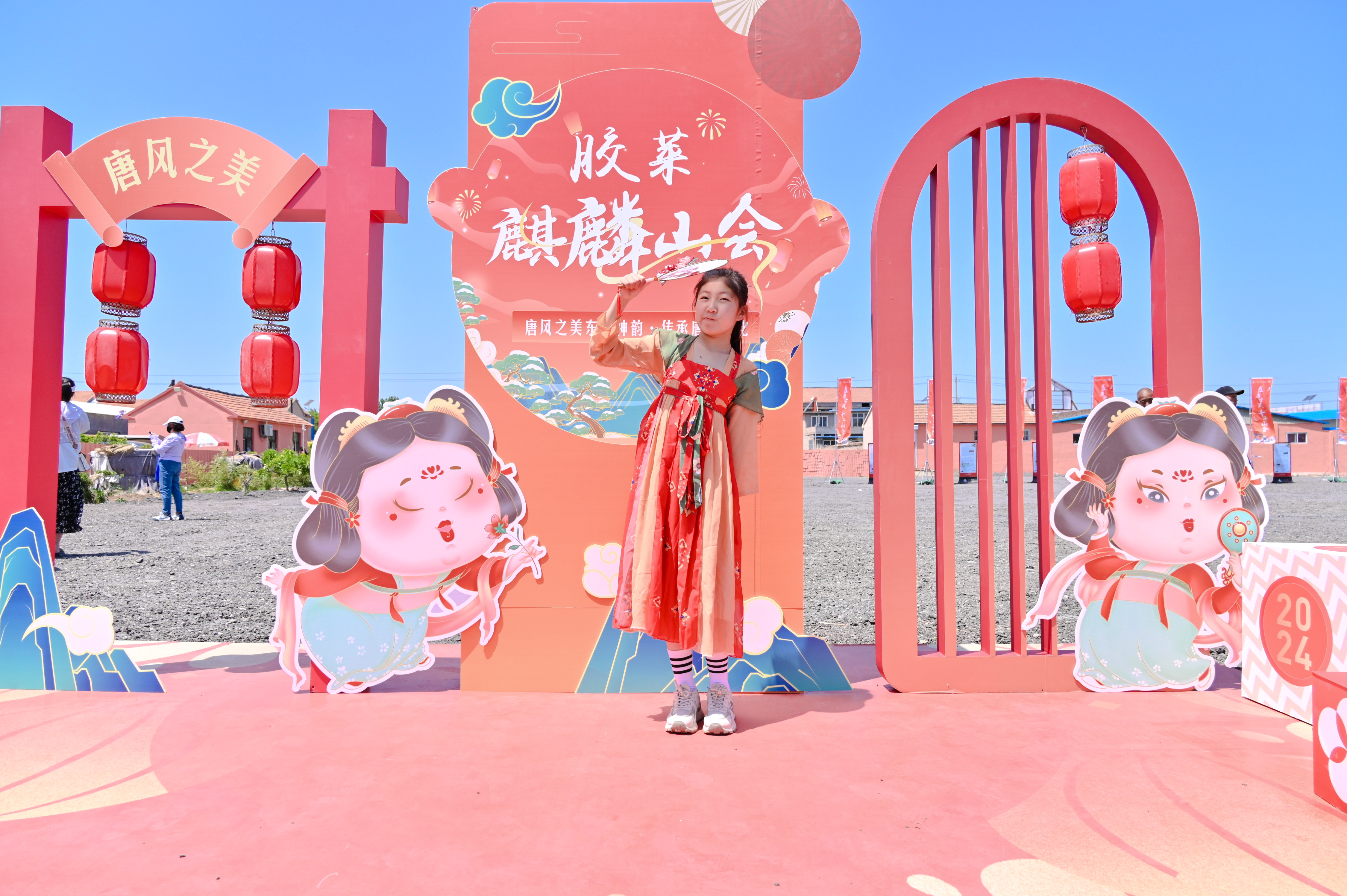 集市常有,但麒麟山會每年就一場。為了突出這一民俗特色,膠州市膠萊街道將唐朝民俗活動搬到了山會上。在“夢回大唐”體驗互動區,市民游客熙熙攘攘,一個個身著唐服的小朋友,或投壺、或在團扇上畫畫、或給麒麟石膏娃娃上色……玩得不亦樂乎。