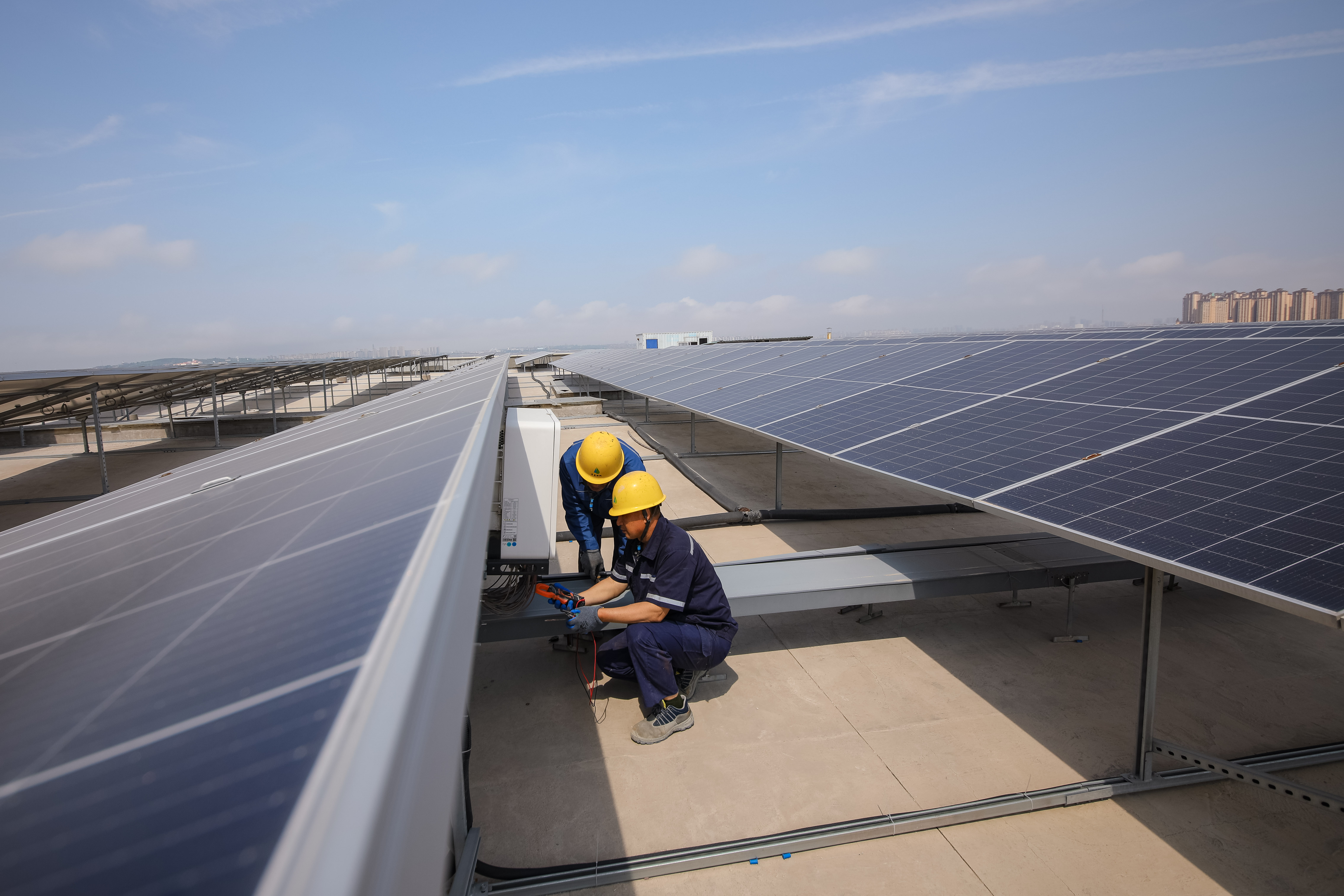 5月22日,在位于山東省青島市李滄區的青島綠帆零碳產業園屋頂光伏電站,工作人員對光伏設備進行巡視檢查維護,確保發電設備穩發滿發。