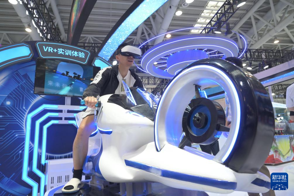 5月23日,觀眾在現場體驗光速飛輪VR摩托競速大型體感游戲機。新華社記者 林善傳 攝
