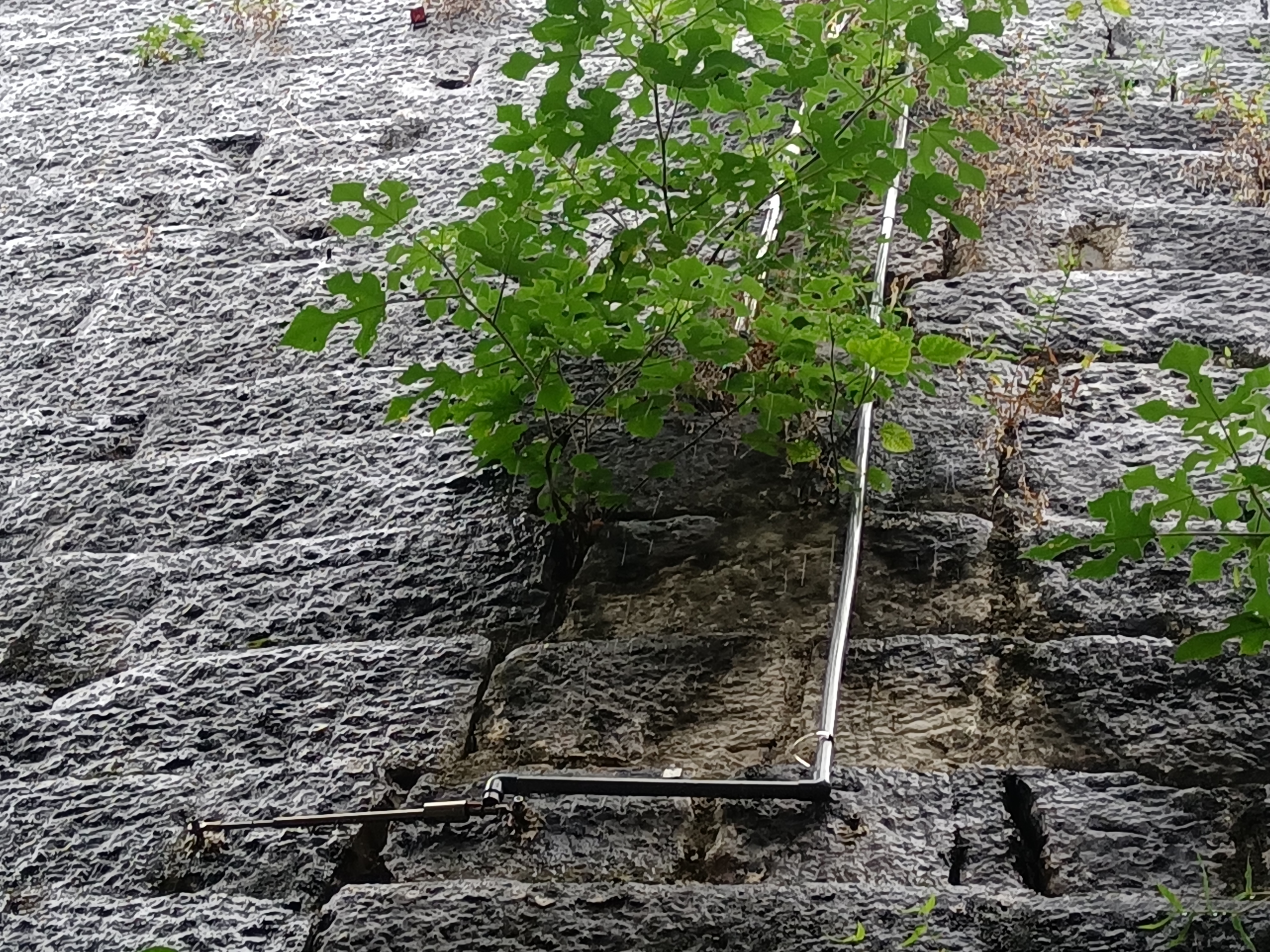 跟隨南京城墻監(jiān)測(cè)預(yù)警中心數(shù)據(jù)采集專(zhuān)員田野步行至南京中華門(mén)城堡旁的赤石磯登城口,只見(jiàn)一條長(zhǎng)約5米的細(xì)長(zhǎng)管線從城墻頂部緊貼著城磚垂落下來(lái),在它旁邊,還有一根細(xì)細(xì)的金屬管,附著在相鄰的兩塊城磚上。