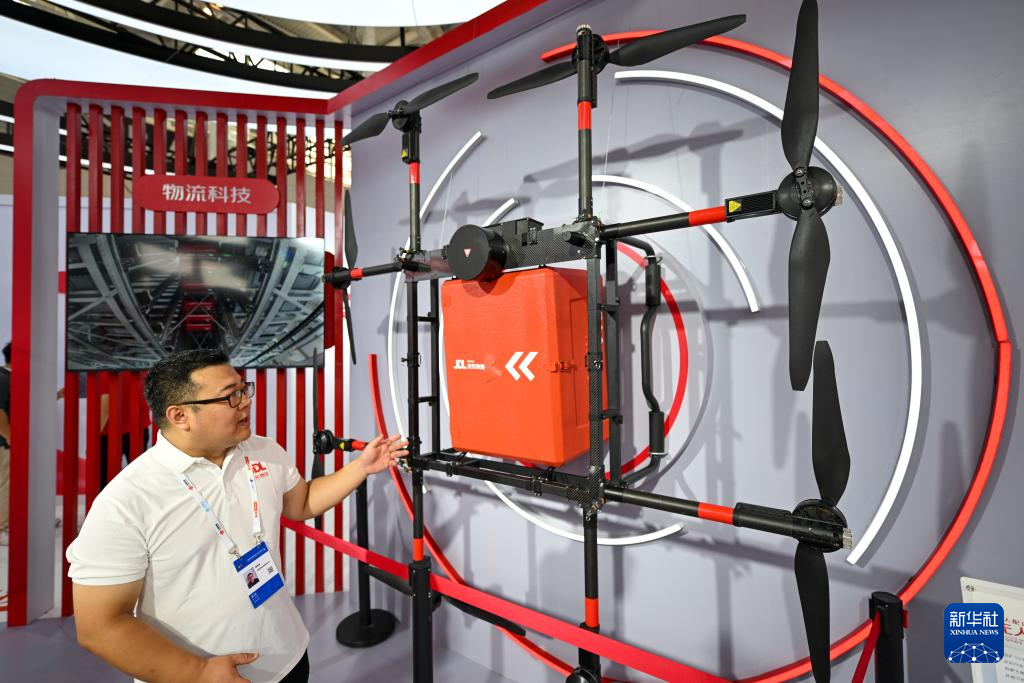 6月20日,參展商在博覽會(huì)現(xiàn)場(chǎng)介紹一款專業(yè)物流配送無(wú)人機(jī)。新華社記者 孫凡越 攝