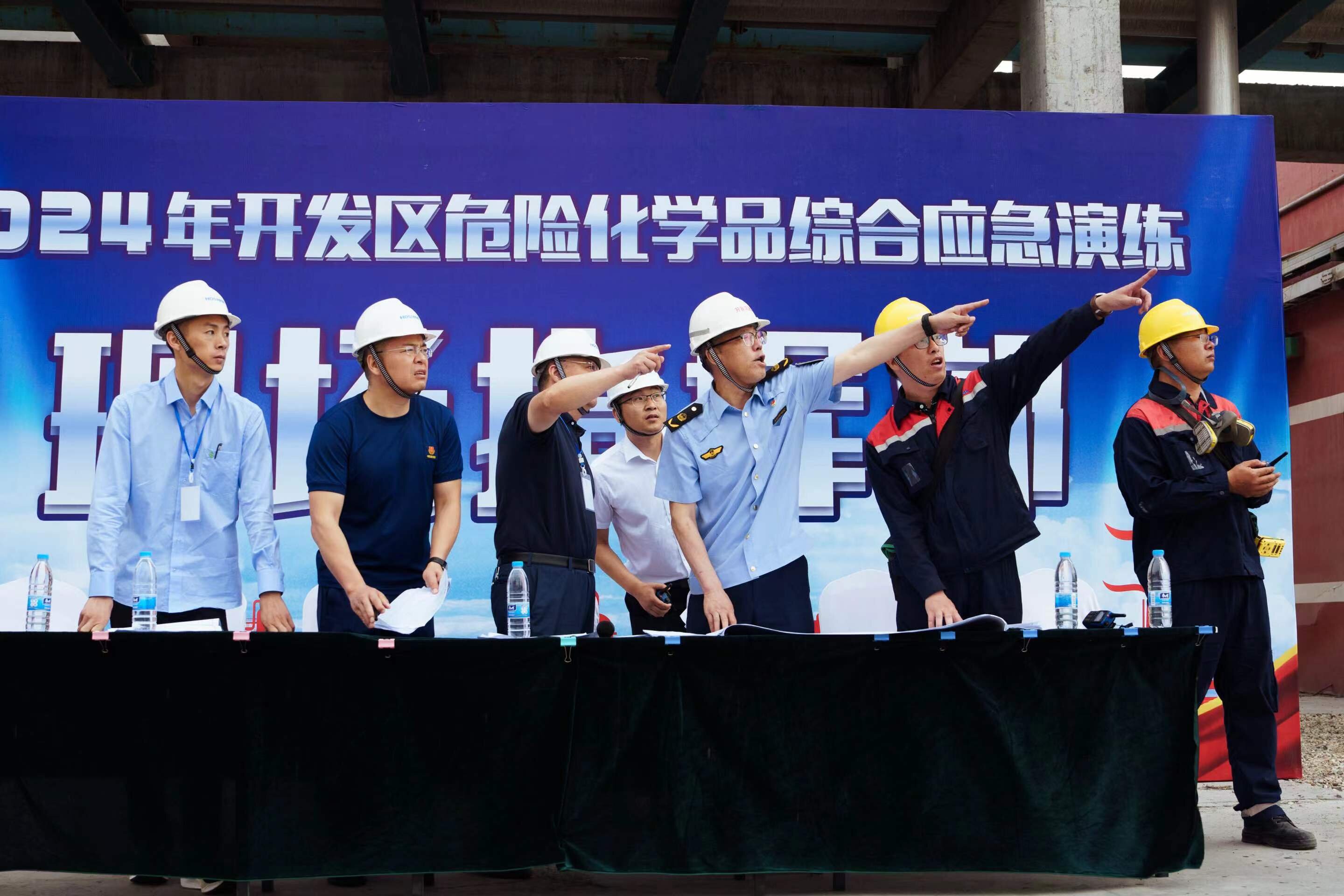此次演練分為企業先期處置、啟動開發區生產安全事故應急響應、響應結束、專家點評和領導總結等階段?,F場按照實景實戰、分級響應、部門聯動的方式開展了一場跨部門、全流程、全要素的協同式綜合模擬演練。共設置醫療救護、應急搶險、應急處置技術、物資保障等6個工作組,對現場進行警戒隔離、提供應急搶險物資、受傷人員(輕微中毒)進行營救、實施滅火、噴淋降溫、泄漏源控制等工作。