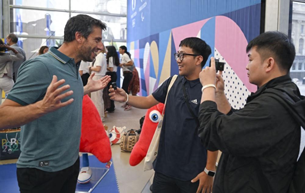 6月27日,巴黎奧組委主席托尼·埃斯坦蓋(左)在巴黎奧運會官方特許商品旗艦店接受新華社記者采訪。新華社記者 賀長山 攝