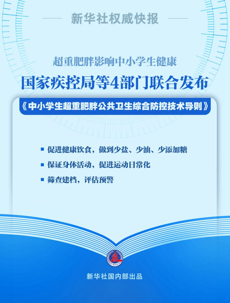 提高全民健康素質,兒童青少年是黃金期。國家疾控局、教育部、國家衛生健康委和國家體育總局22日聯合發布《中小學生超重肥胖公共衛生綜合防控技術導則》,創新性提出預防為主、早期干預和疾病預警的三級預防策略。