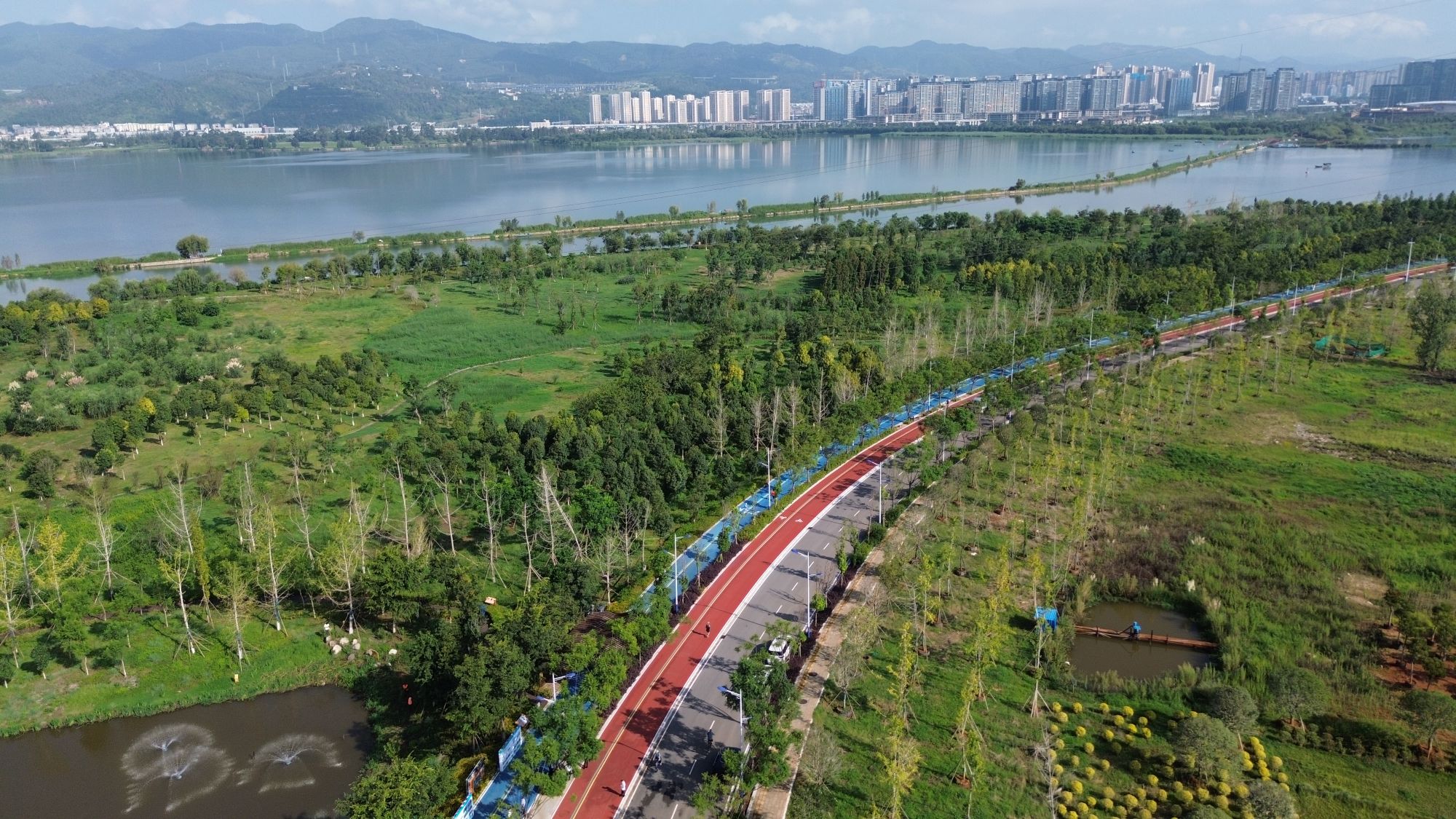 環湖紅藍雙色的步道,宛若彩虹,穿越碧草明波,成為昆明新的“打卡點”。剛剛結束的2024滇池東岸國際咖啡文化嘉年華活動,參與人數達到65萬人次,拉動消費近億元。