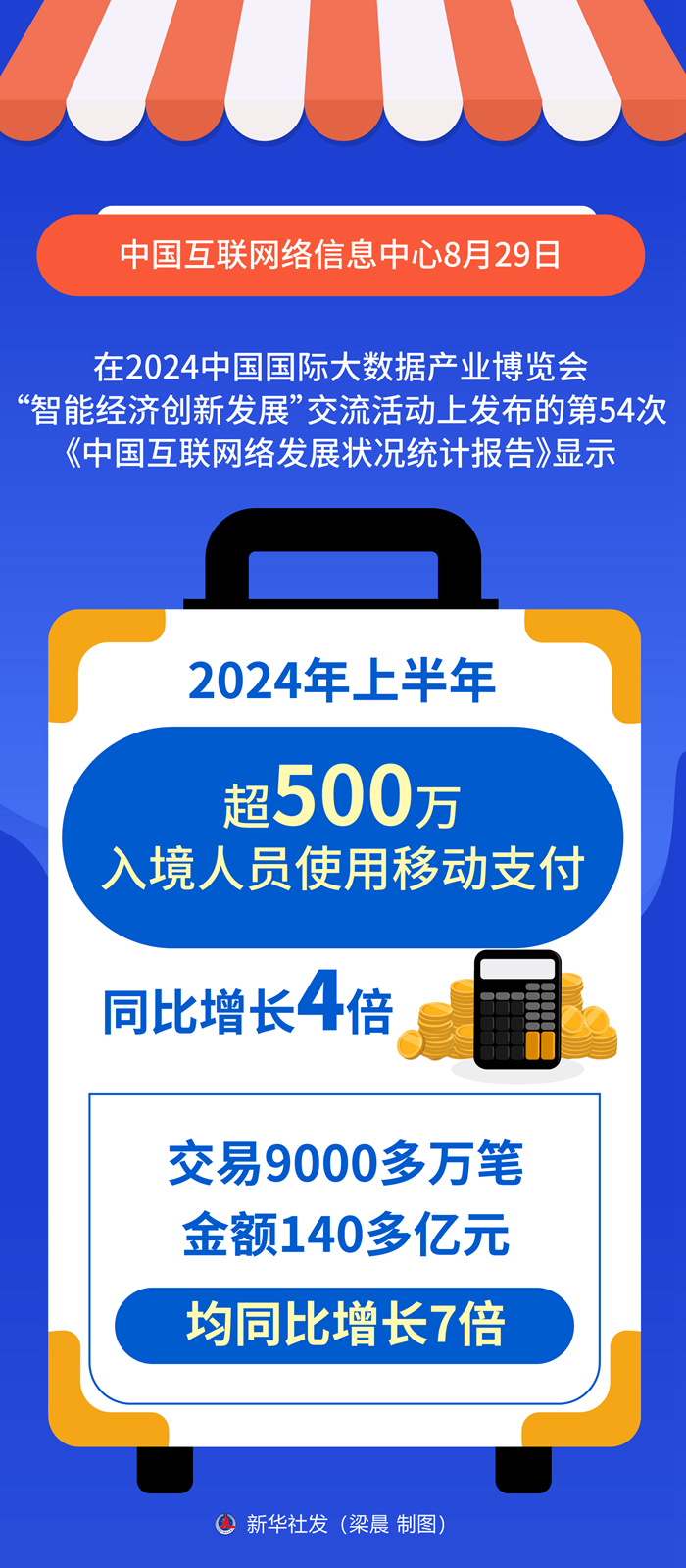 中國互聯網絡信息中心29日在2024中國國際大數據產業博覽會“智能經濟創新發展”交流活動上發布第54次《中國互聯網絡發展狀況統計報告》,其中顯示,今年上半年,超500萬入境人員使用移動支付,同比增長4倍;交易9000多萬筆,金額140多億元,均同比增長7倍。