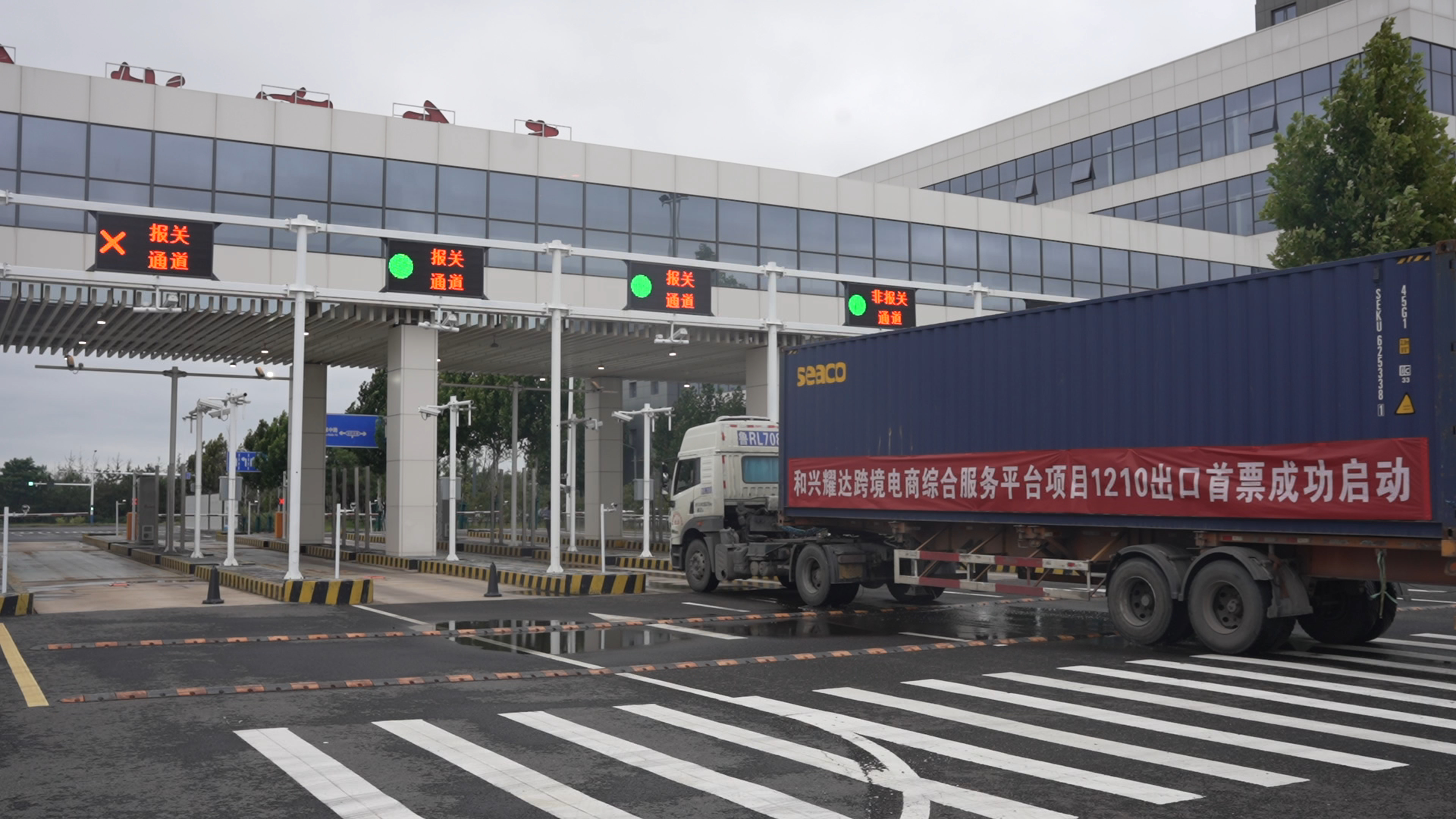 8月28日,一輛滿載假發、輪胎、支架等貨物的廂式貨車,從海關監管通道駛出青島空港綜合保稅區,前往青島膠東國際機場運往美國。