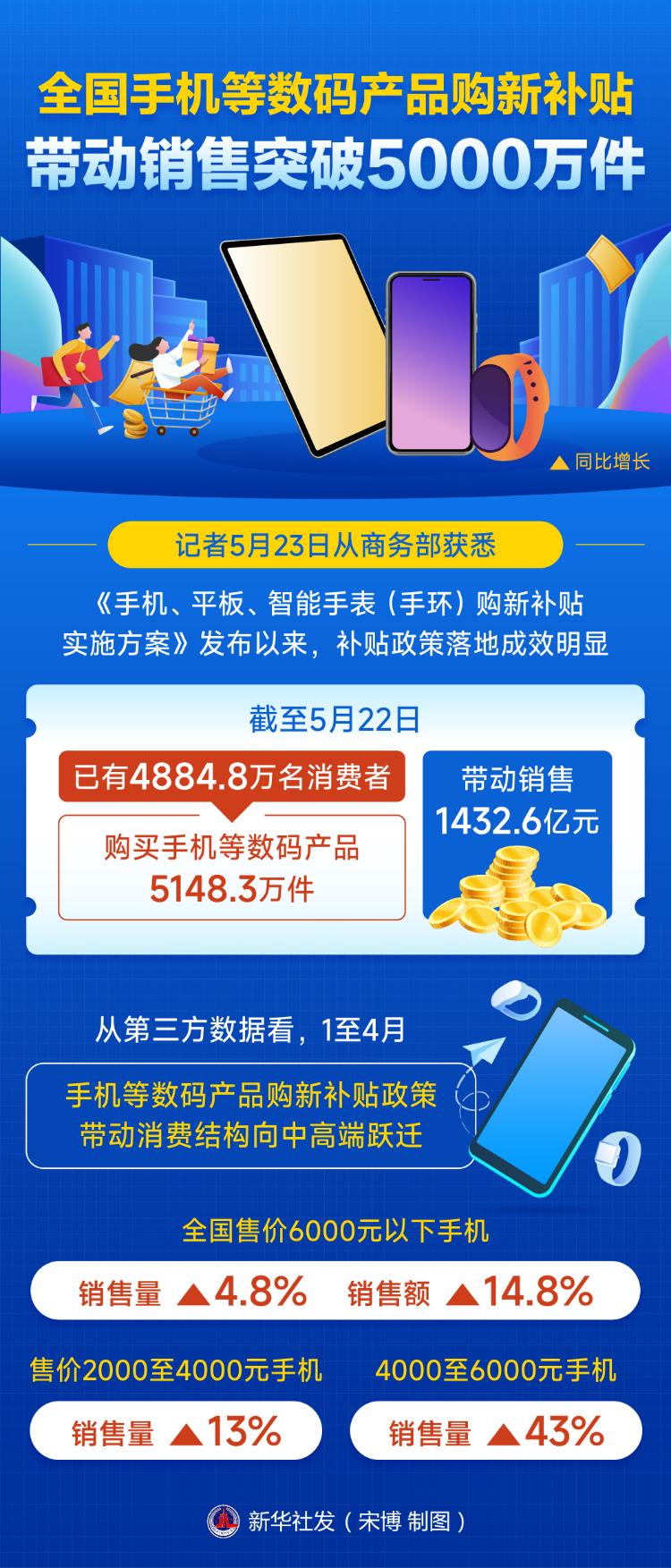 記者23日從商務部獲悉,《手機、平板、智能手表(手環(huán))購新補貼實施方案》發(fā)布以來,補貼政策落地成效明顯,截至5月22日,已有4884.8萬名消費者購買手機等數(shù)碼產(chǎn)品5148.3萬件,帶動銷售1432.6億元。