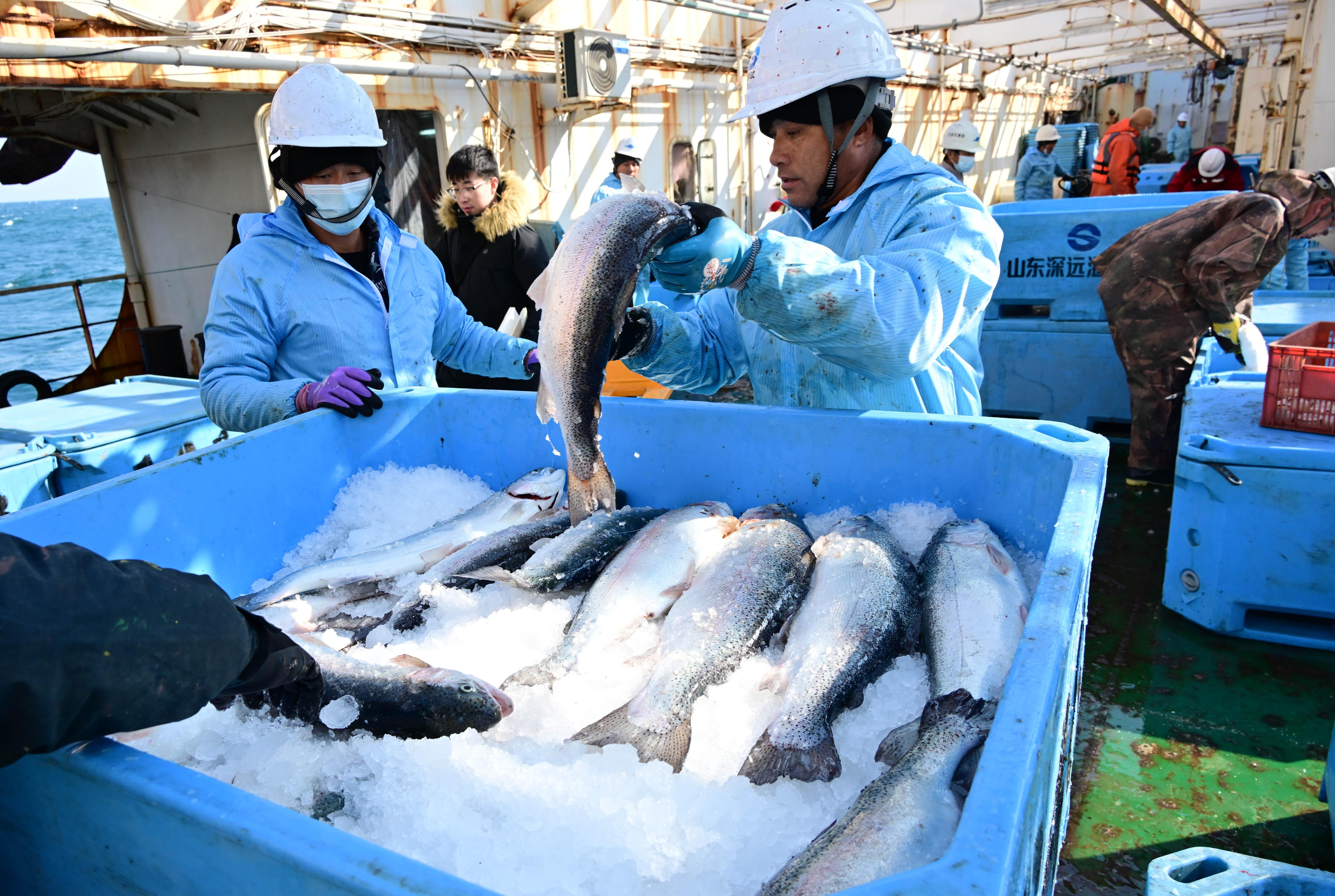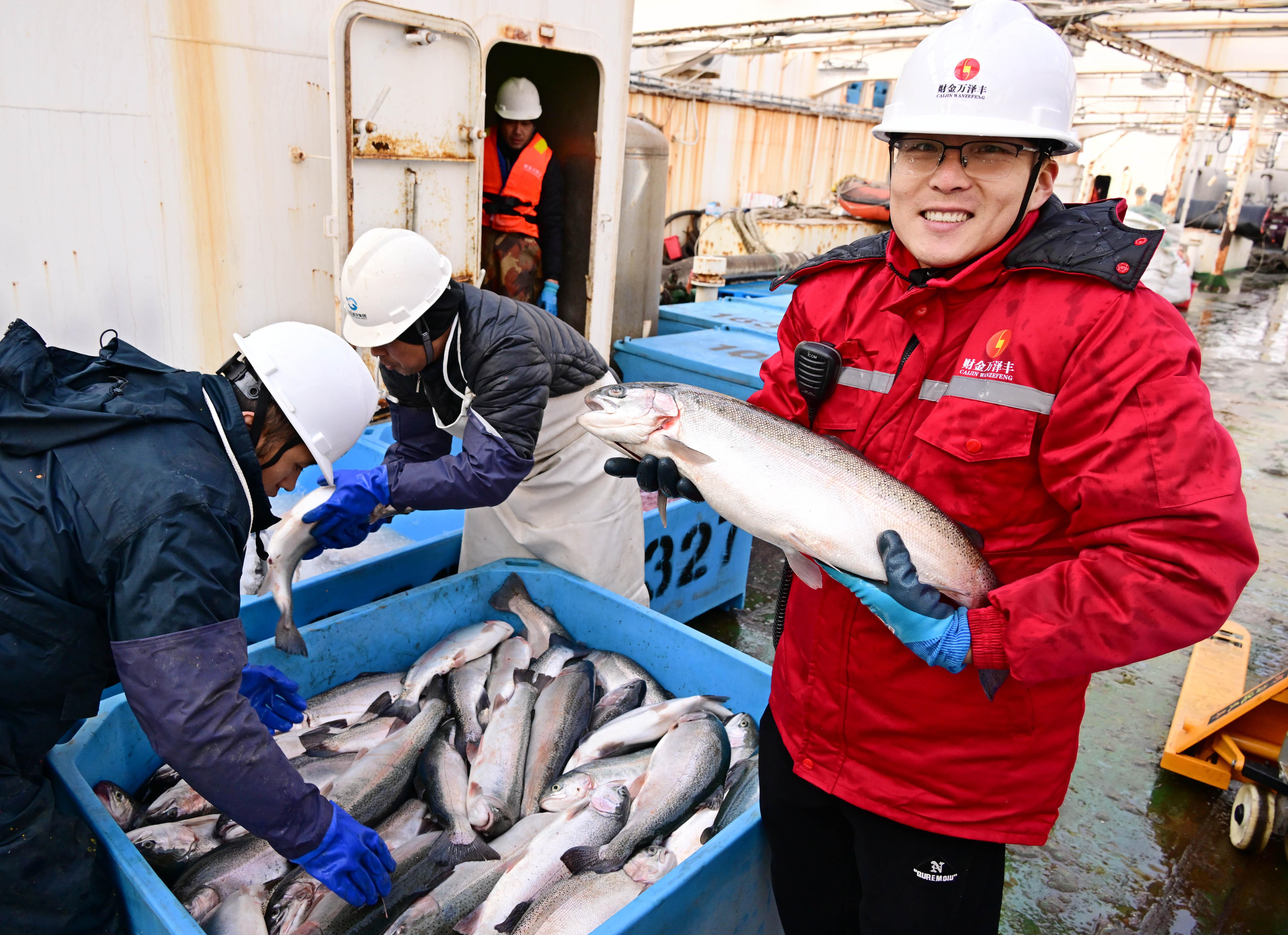 目光下移,直至30米深的冷水團(tuán)中,身披銀白鱗片的三文魚在“深藍(lán)2號”養(yǎng)殖網(wǎng)箱里穿梭、翻騰。5個月后,它們將被送往天南海北,端上千家萬戶的餐桌。