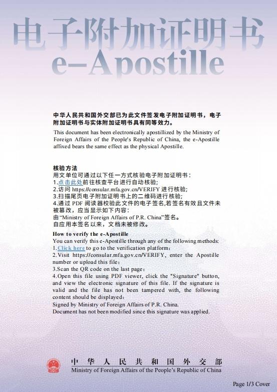 自試點之日起,申請人在中國貿促會申辦原產地證書,可同步申辦電子附加證明書,實現“一站式、零跑腿”辦理。我國簽發的電子附加證明書與實體附加證明書具有同等效力。電子附加證明書可通過外交部“領事認證/附加證明書在線核查系統”(https://consular.mfa.gov.cn/VERIFY)在線核驗。
