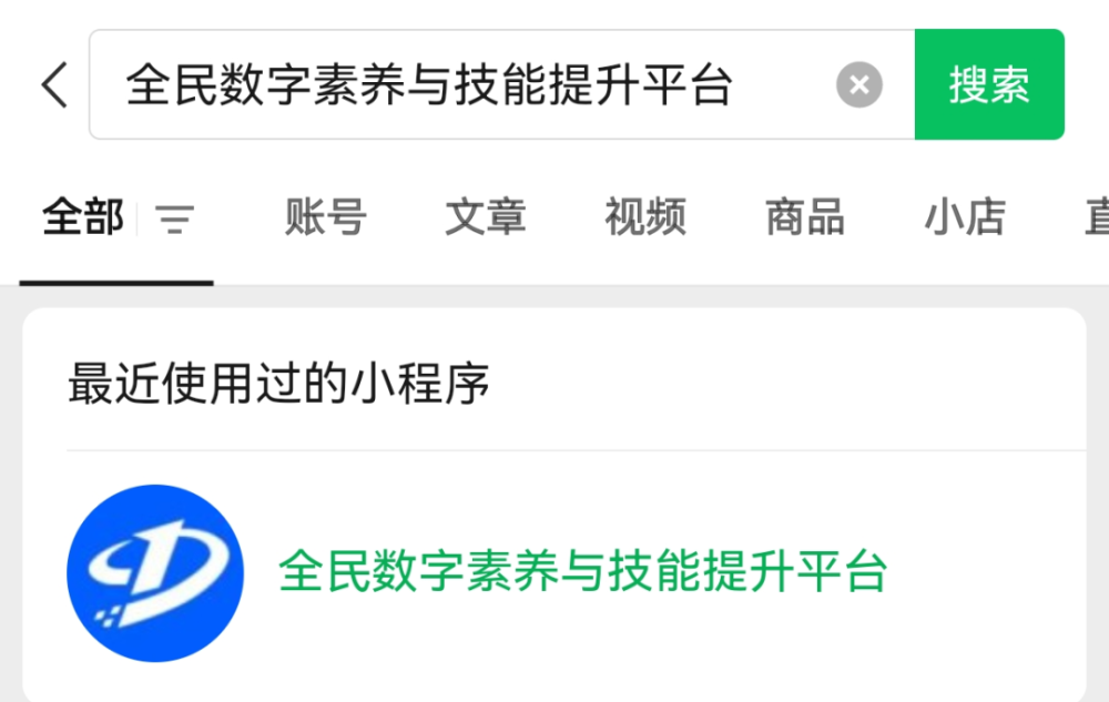 2.打開微信APP,在搜索欄輸入“全民數(shù)字素養(yǎng)與技能提升平臺”,點擊進入小程序。