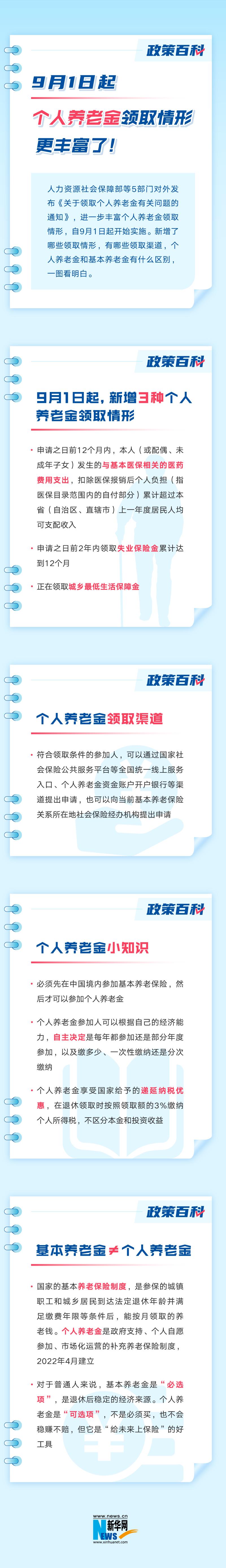近日,人力資源社會保障部等5部門對外發布《關于領取個人養老金有關問題的通知》,進一步豐富個人養老金領取情形,自9月1日起開始實施。