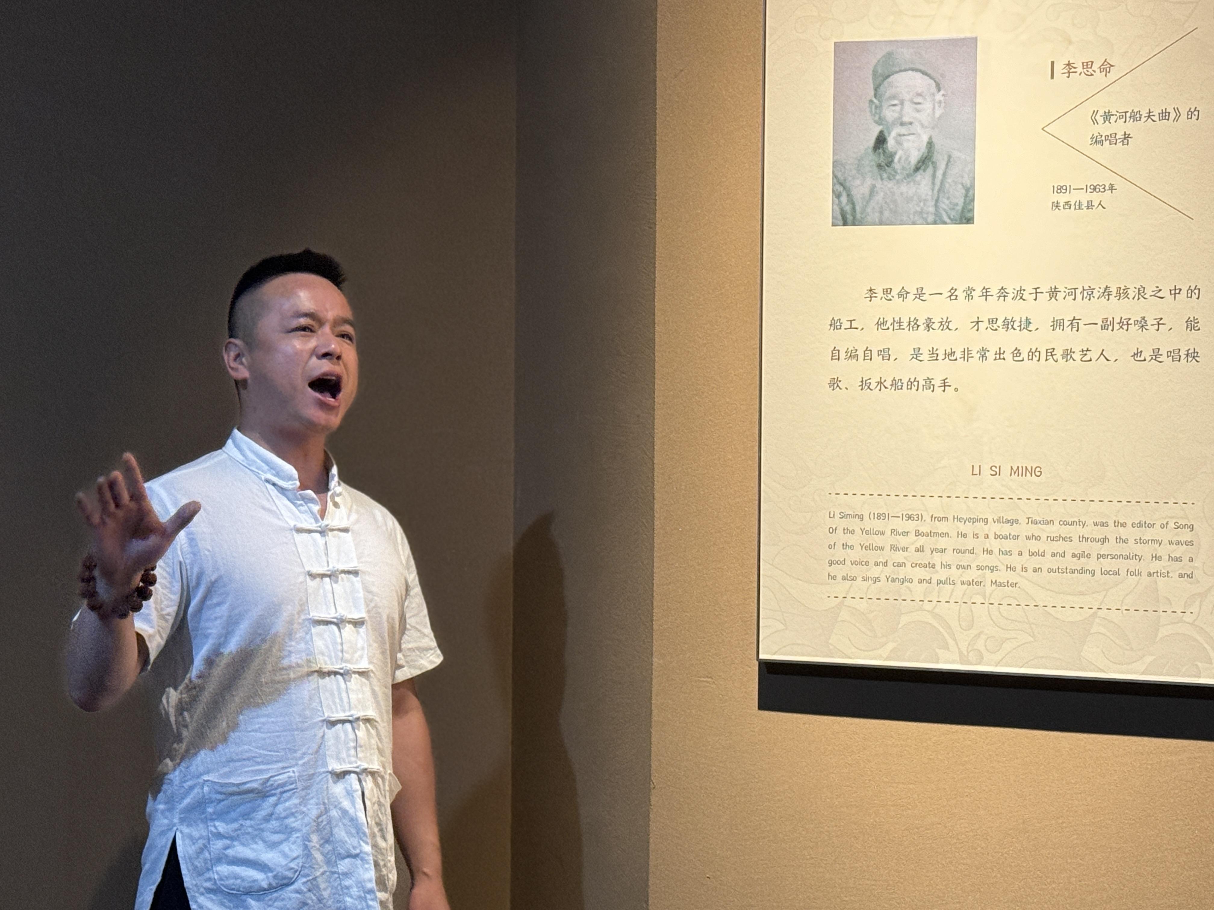 “你曉得天下黃河幾十幾道彎……”陜北民歌博物館演唱老師王志行一開(kāi)嗓,游客立刻被“釘”在原地。他沒(méi)有拿擴(kuò)音器,也沒(méi)有介紹展品,而是站在一幅黃河奔騰的全息投影前,用一曲《黃河船夫曲》把所有人“拽”進(jìn)了黃河岸邊的纖夫勞作現(xiàn)場(chǎng)。