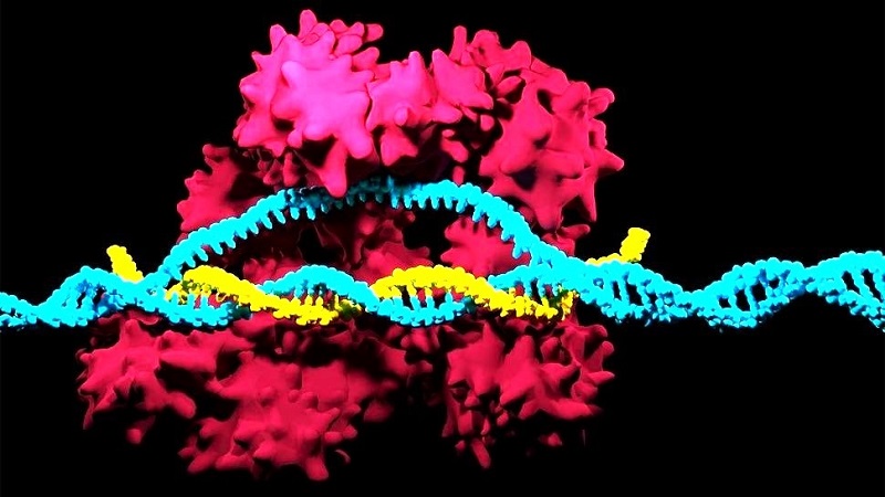 CRISPR-Cas系統(tǒng)可以在精確位置剪切DNA。圖為一種Cas酶(深粉色)正準(zhǔn)備切割目標(biāo)DNA鏈(藍(lán)色),切割點(diǎn)為黃色。