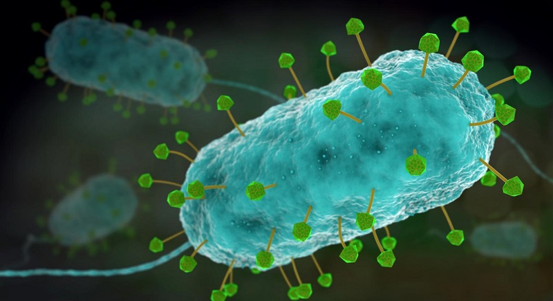 噬菌體(綠黃色)攻擊細(xì)菌(藍(lán)色)。