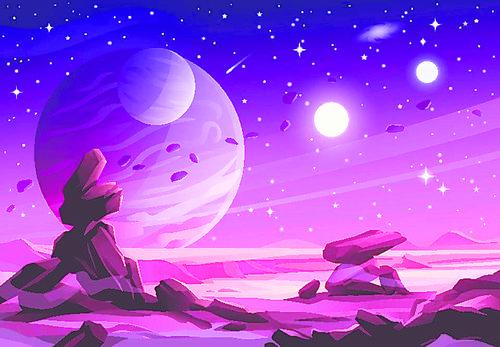一顆荒涼而貧瘠的外星,背景是紫色的天空,以及恒星、行星、衛星、小行星等(藝術想象圖)。 圖片來源:美國《福布斯》雙周刊網站