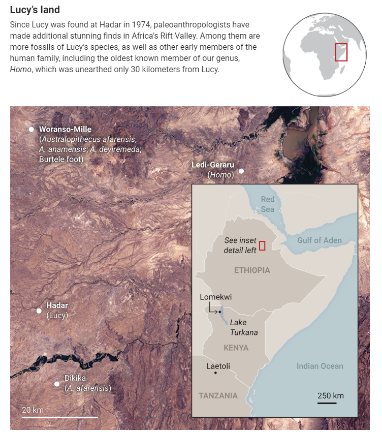 1974年,科學家在埃塞俄比亞哈達爾地區320萬年前的沉積層中發現了化石AL 288-1。這是一具南方古猿阿法種的部分骨骼,這具標本獲得了一個沿用至今的綽號:露西。
